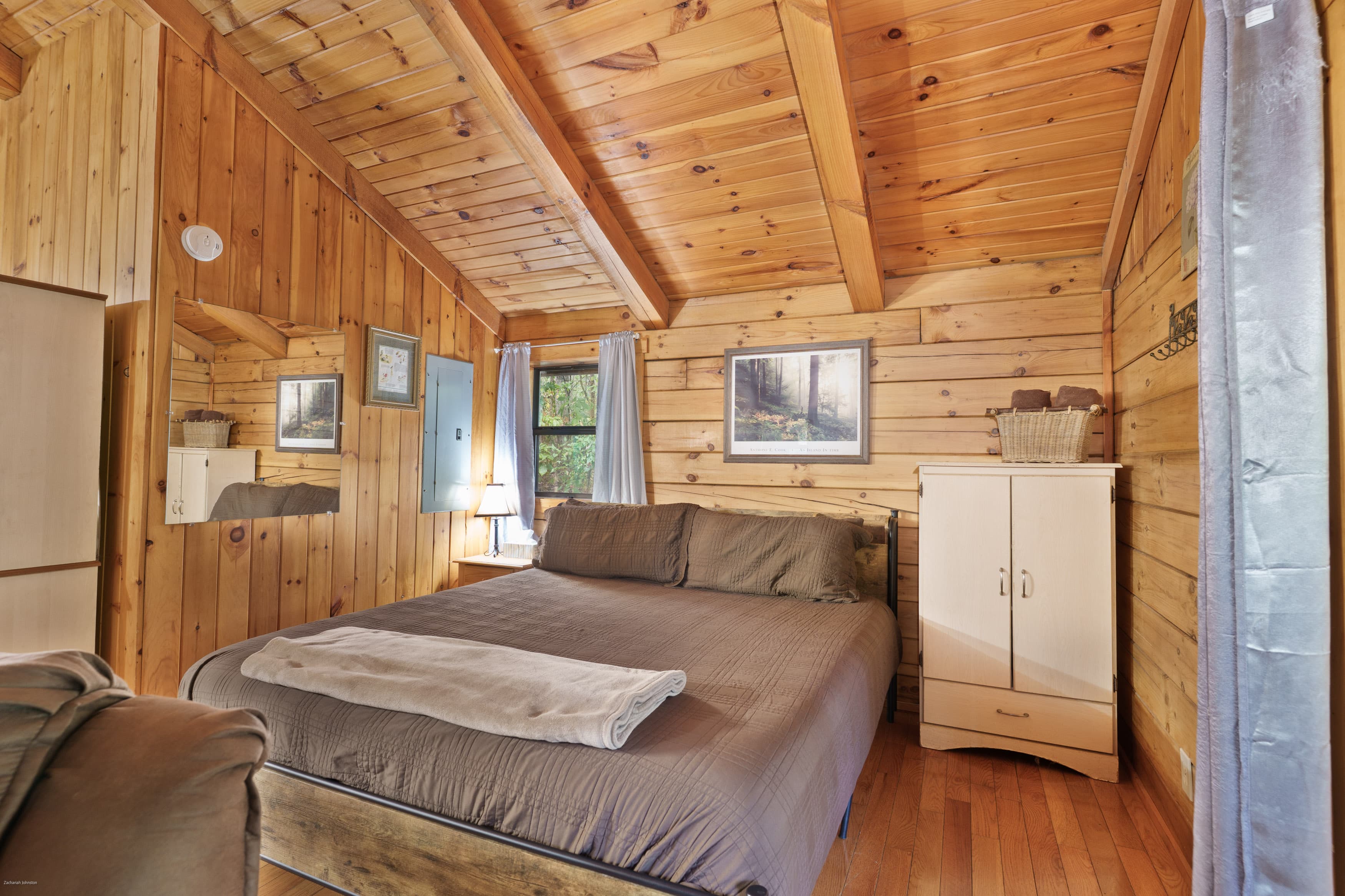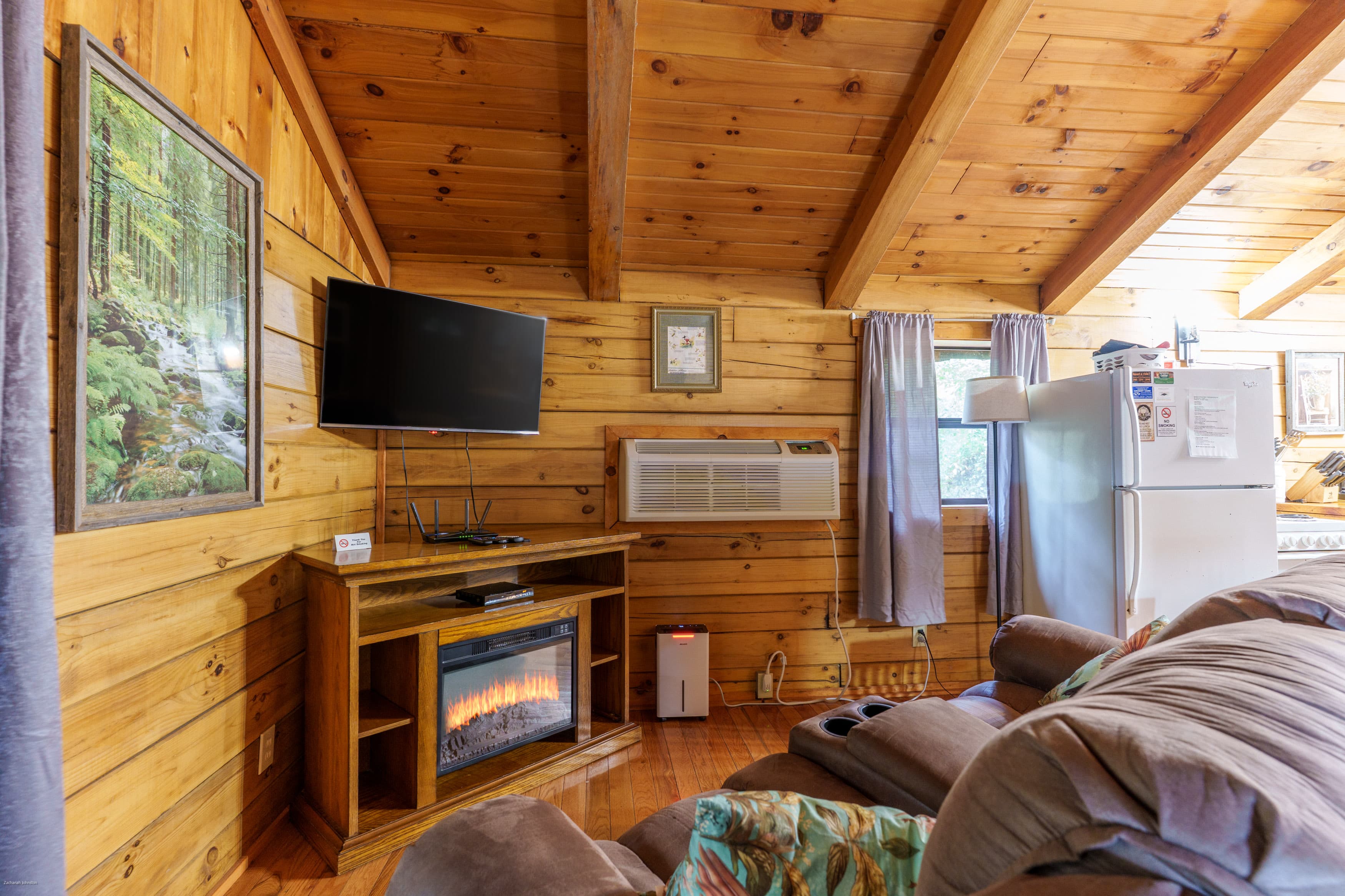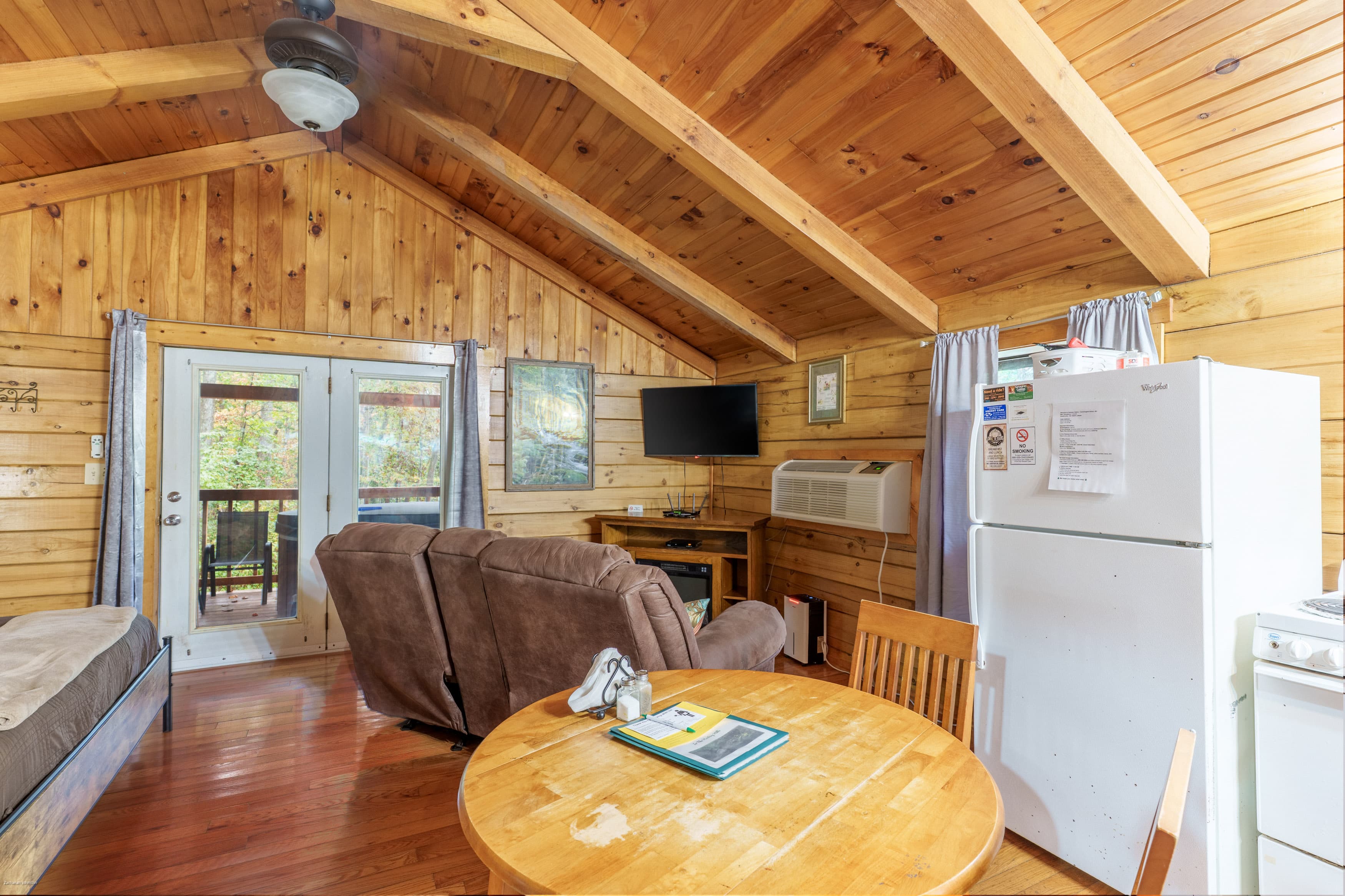 NOT PET FRIENDLY. Hummingbird Haven is an intimate, open concept log cabin with a king size bed. It is located on our Bishop's Ridge location for two guests. Their is a wall AC/Heat unit, starlink wifi, streaming tv, ceiling fan, electric fireplace, full bathroom with a shower and a full standard kitchen with a keurig coffee maker. The back deck area over looks a stocked pond and has a hot tub and gas grill.