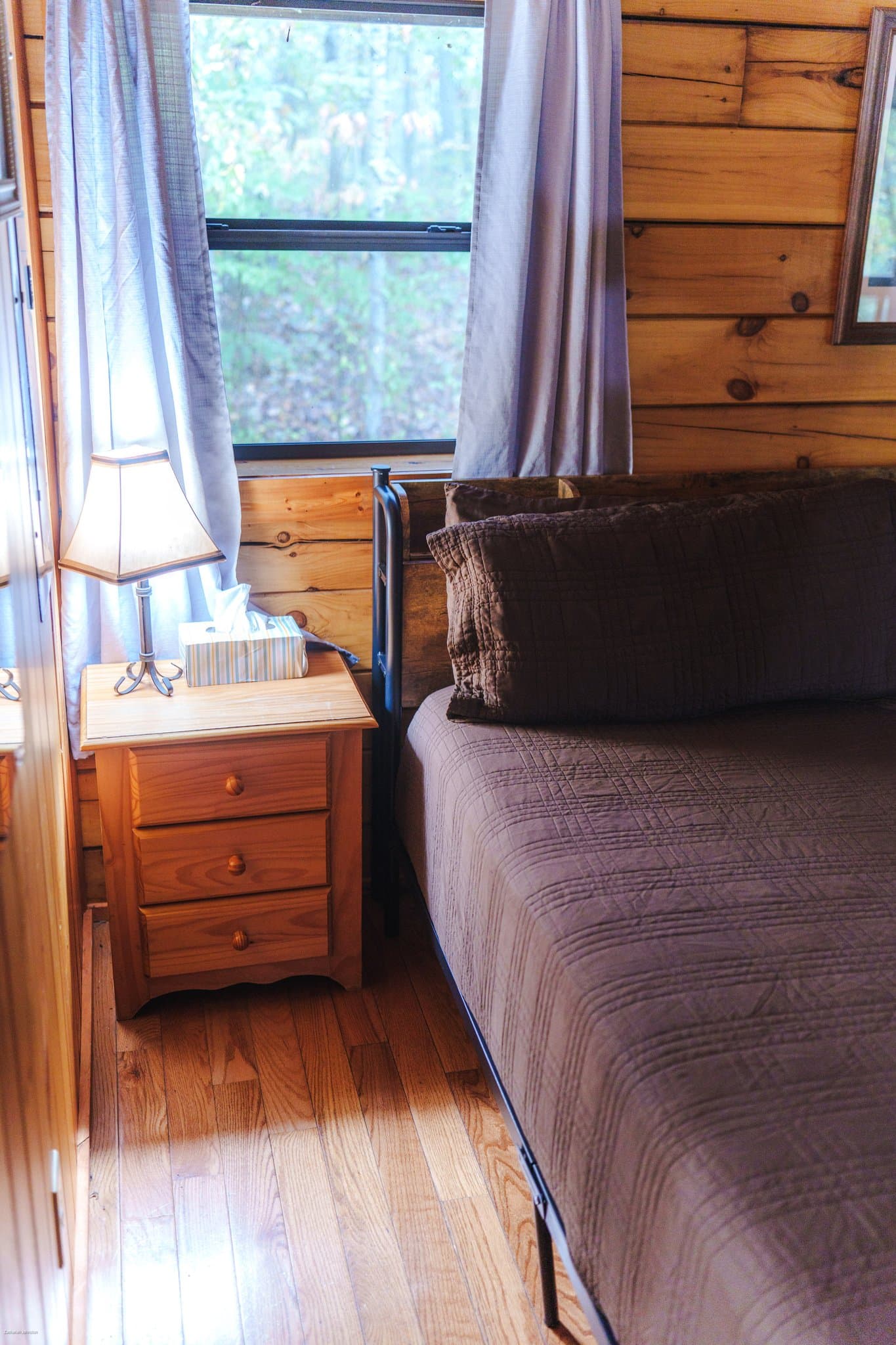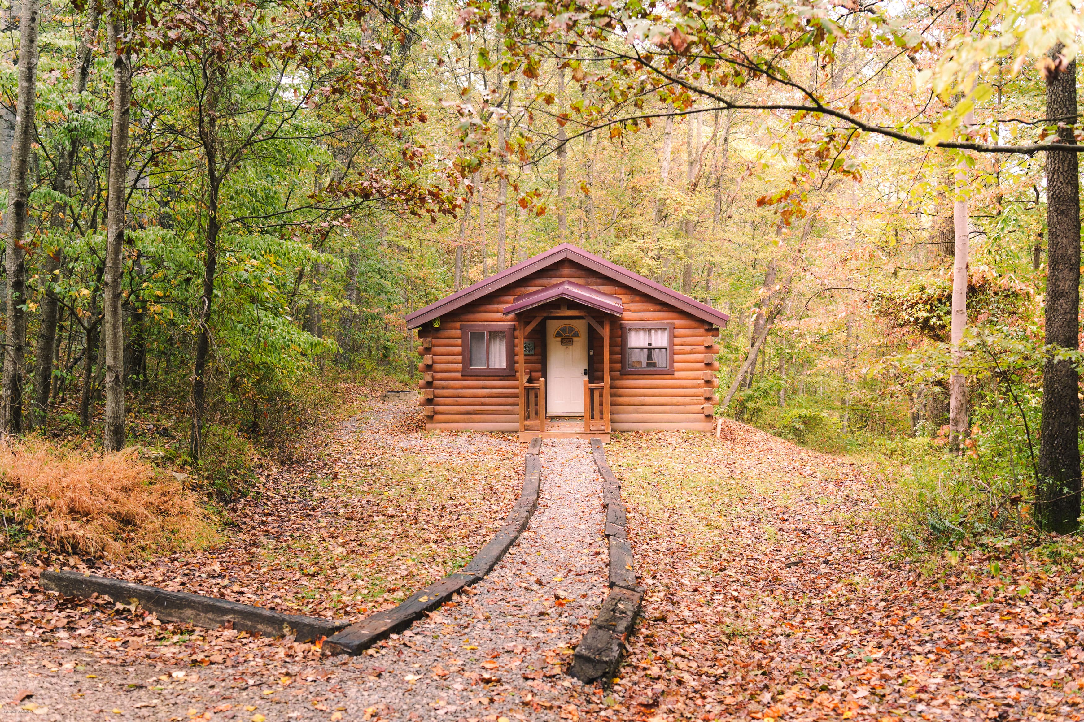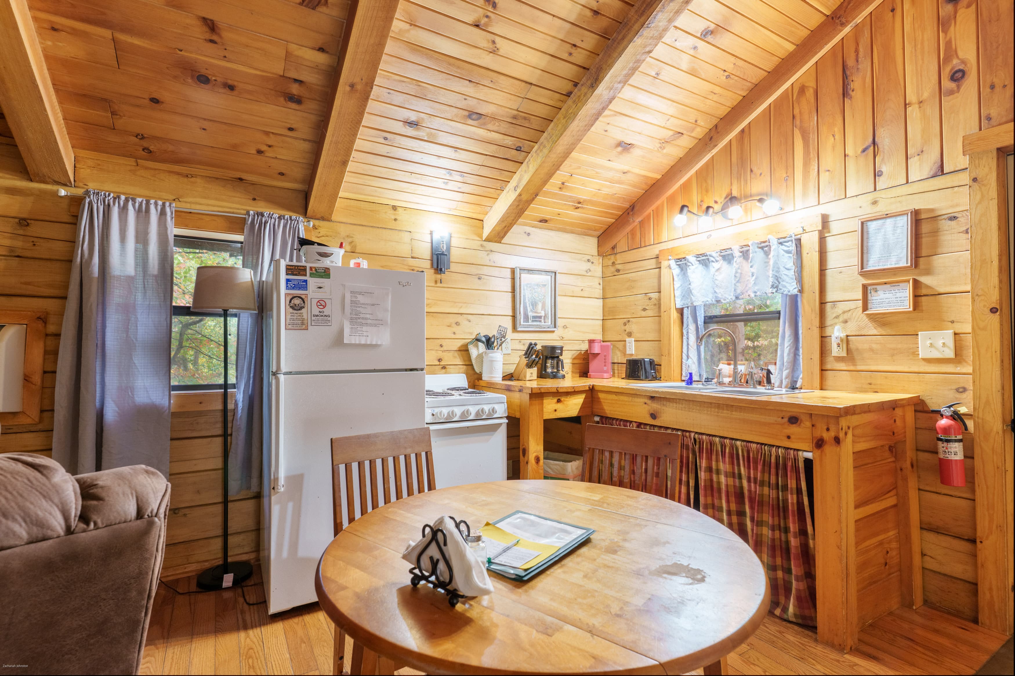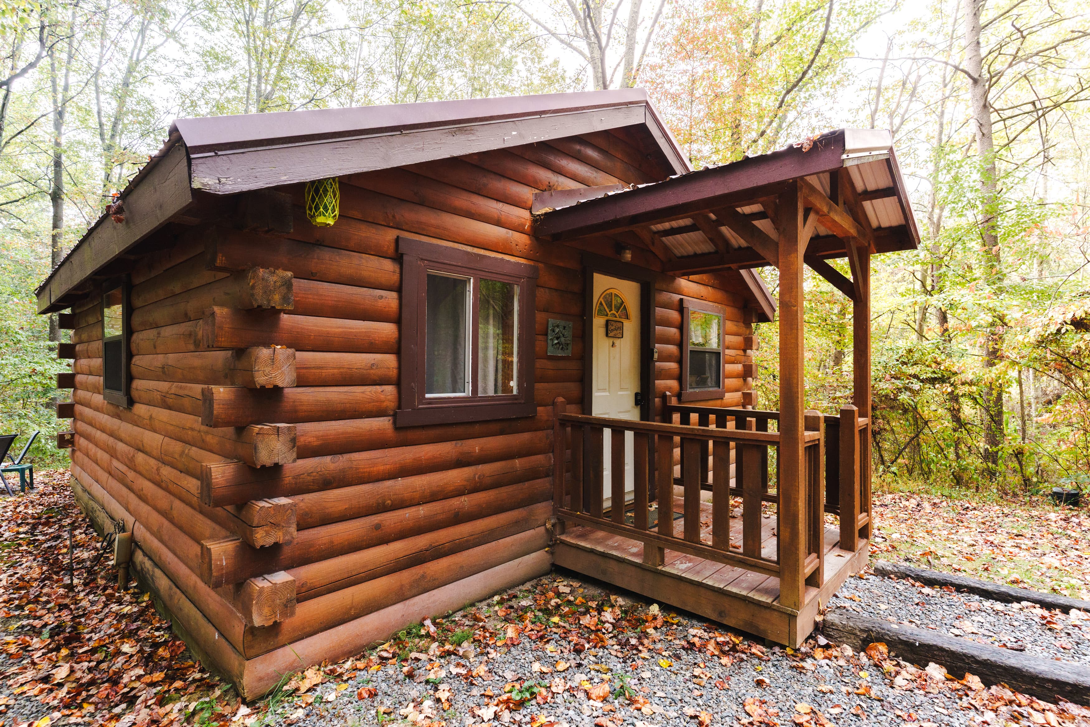 NOT PET FRIENDLY. Hummingbird Haven is an intimate, open concept log cabin with a king size bed. It is located on our Bishop's Ridge location for two guests. Their is a wall AC/Heat unit, starlink wifi, streaming tv, ceiling fan, electric fireplace, full bathroom with a shower and a full standard kitchen with a keurig coffee maker. The back deck area over looks a stocked pond and has a hot tub and gas grill.