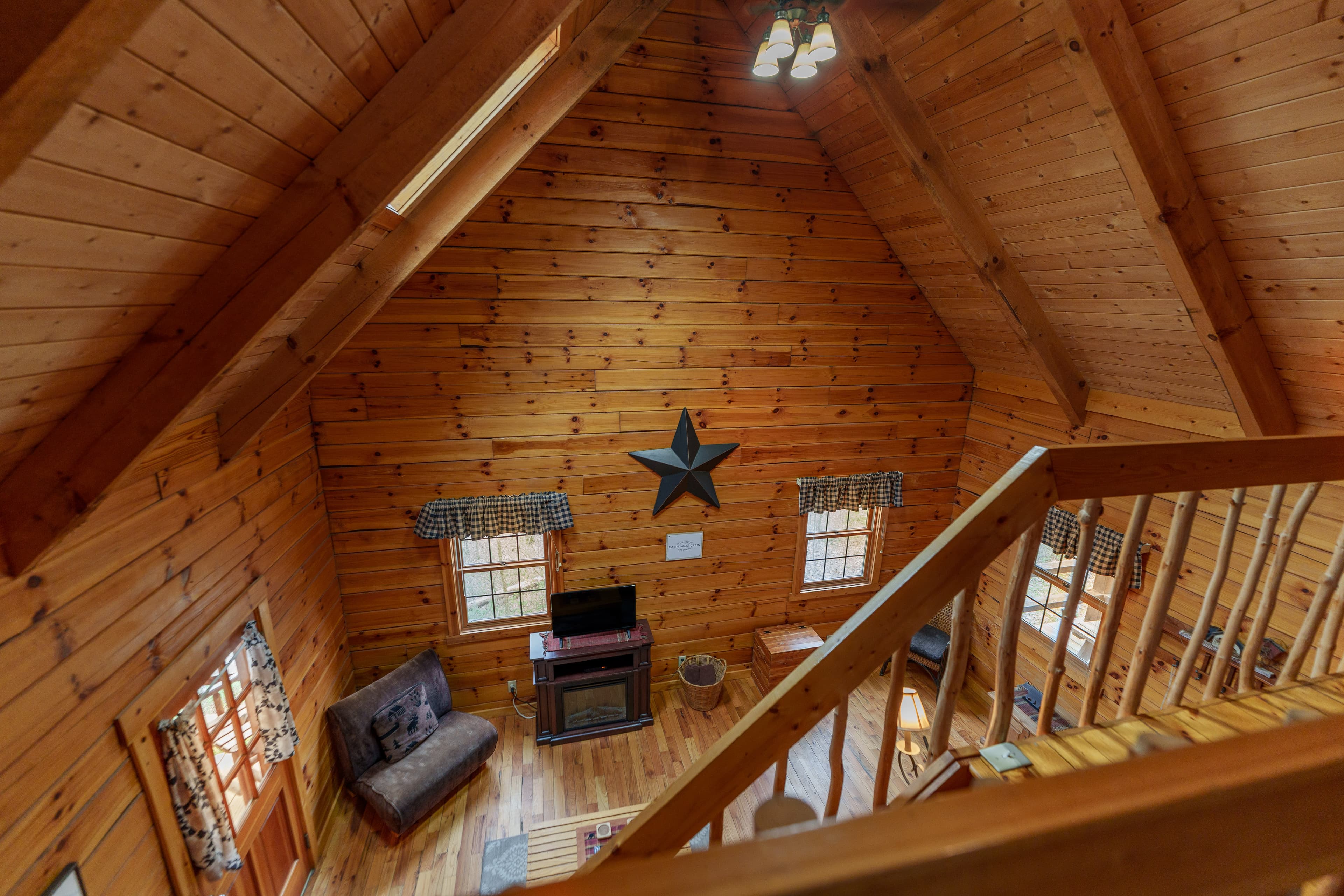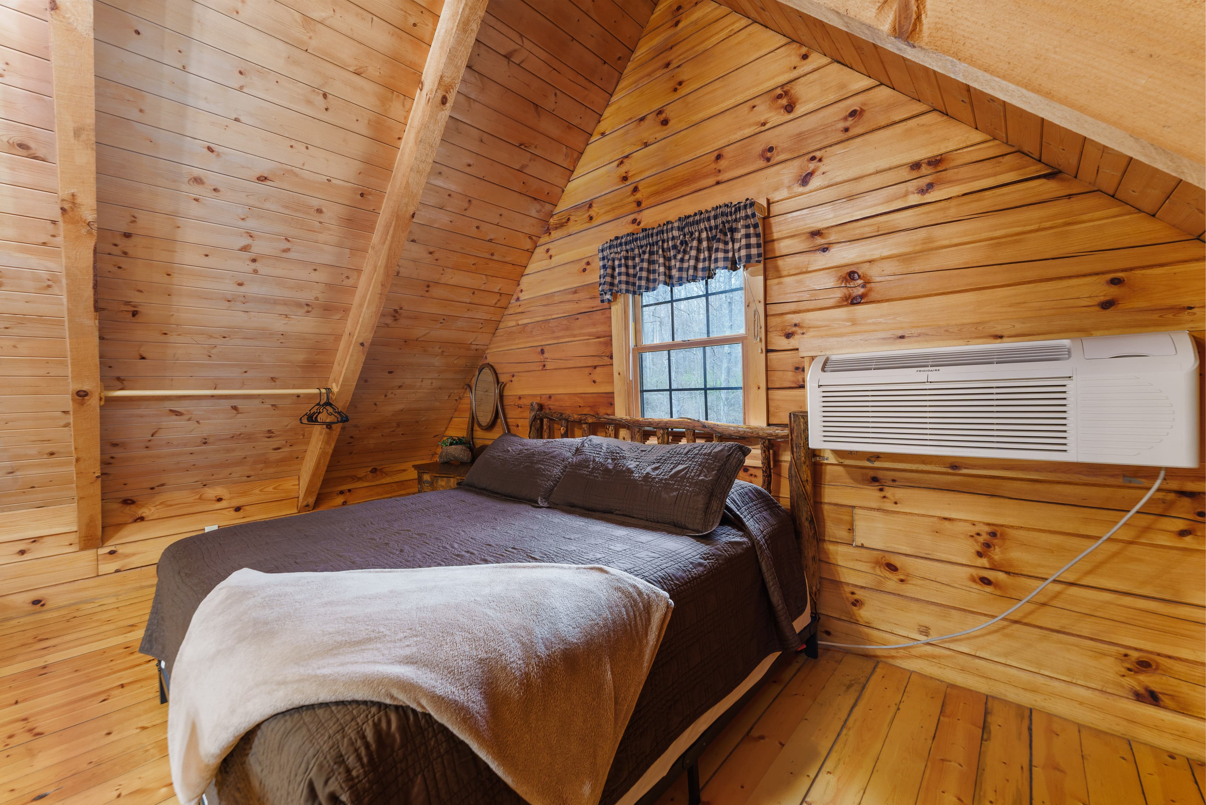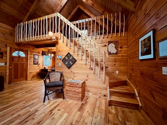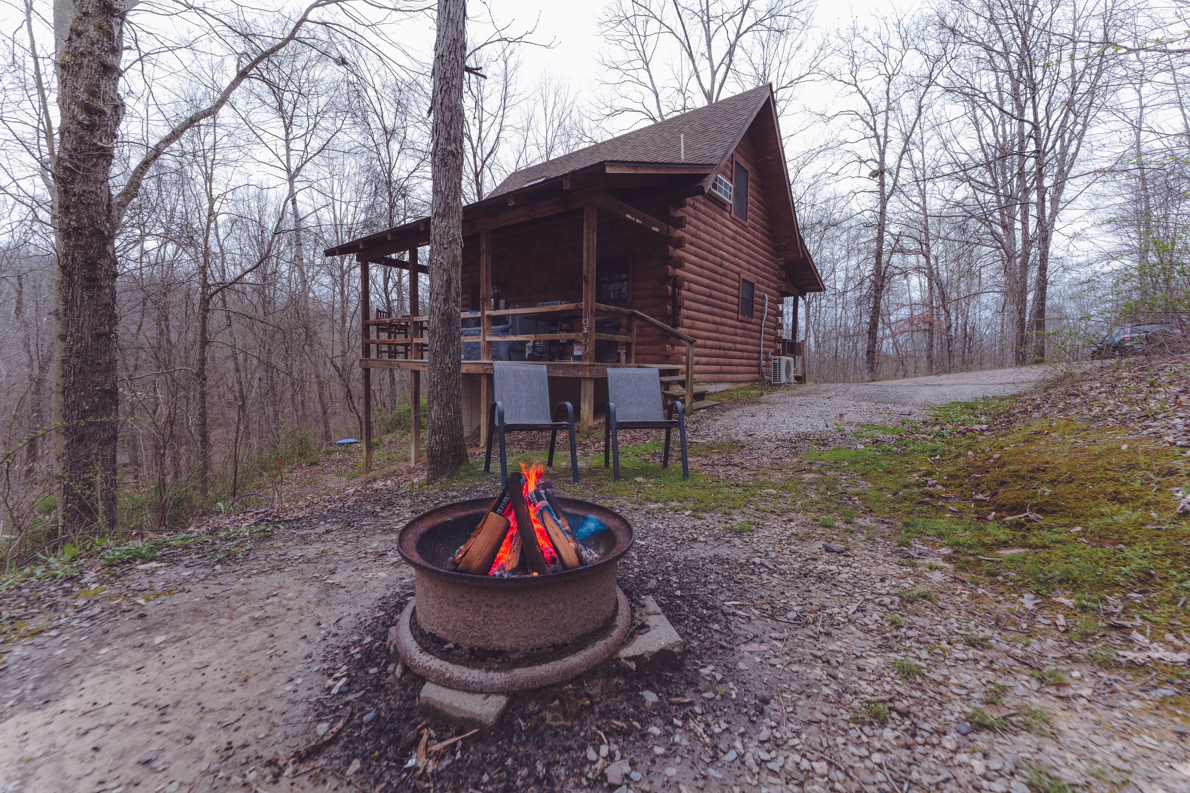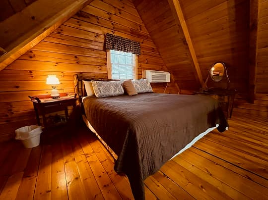 PET FRIENDLY. The Eagles Nest is a four person loft-style cabin, with a king bed in the loft and a queen pullout sofa in the living space. The Eagles Nest is also set up with a hot tub, electric fireplace, Wall Heat/AC unit, WIFI with smart TV and is streaming only, fire pit and gas grill. NOTE: This is a steep driveway and four-wheel drive recommended during summer months and required in inclement weather. DISCLOSURE: Outside security camera on the front porch.