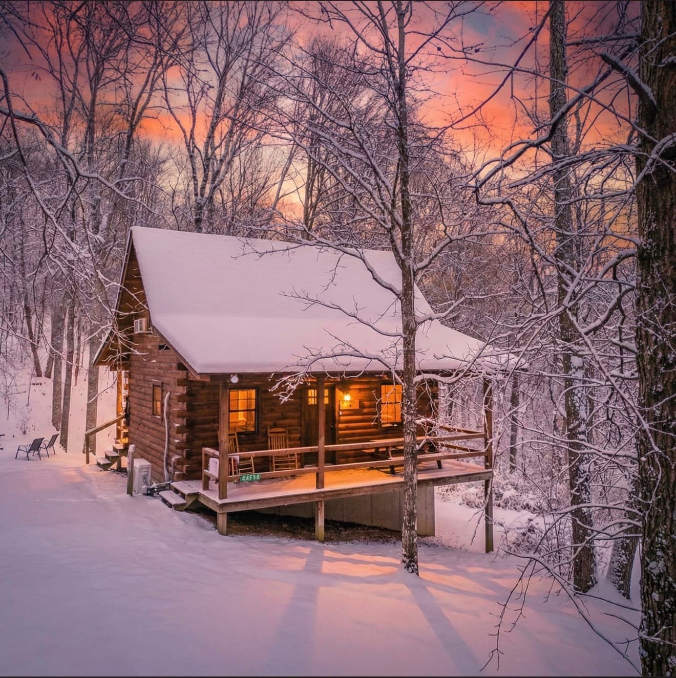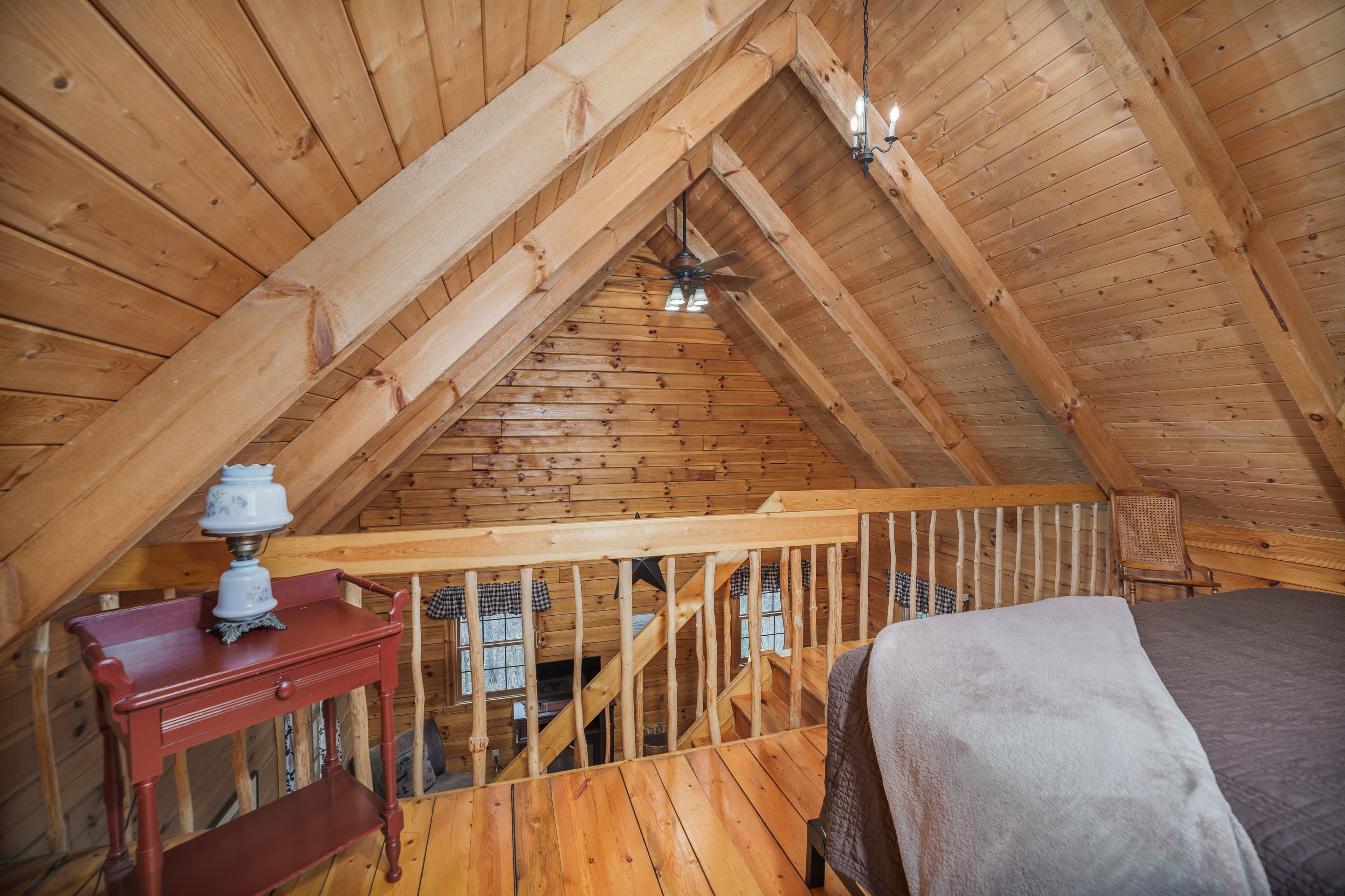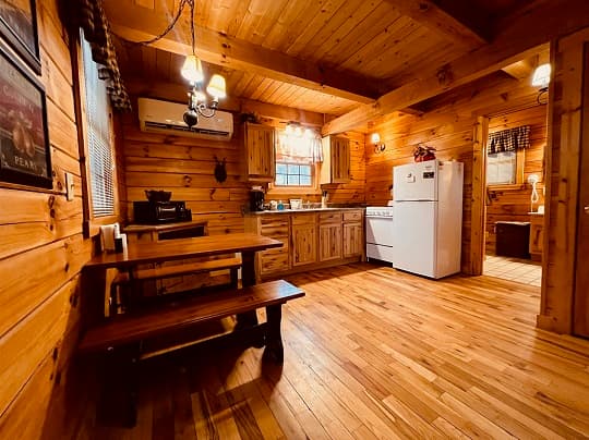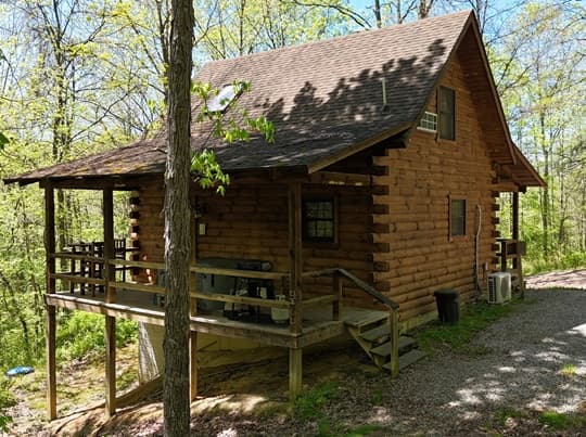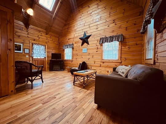 PET FRIENDLY. The Eagles Nest is a four person loft-style cabin, with a king bed in the loft and a queen pullout sofa in the living space. The Eagles Nest is also set up with a hot tub, electric fireplace, Wall Heat/AC unit, WIFI with smart TV and is streaming only, fire pit and gas grill. NOTE: This is a steep driveway and four-wheel drive recommended during summer months and required in inclement weather. DISCLOSURE: Outside security camera on the front porch.