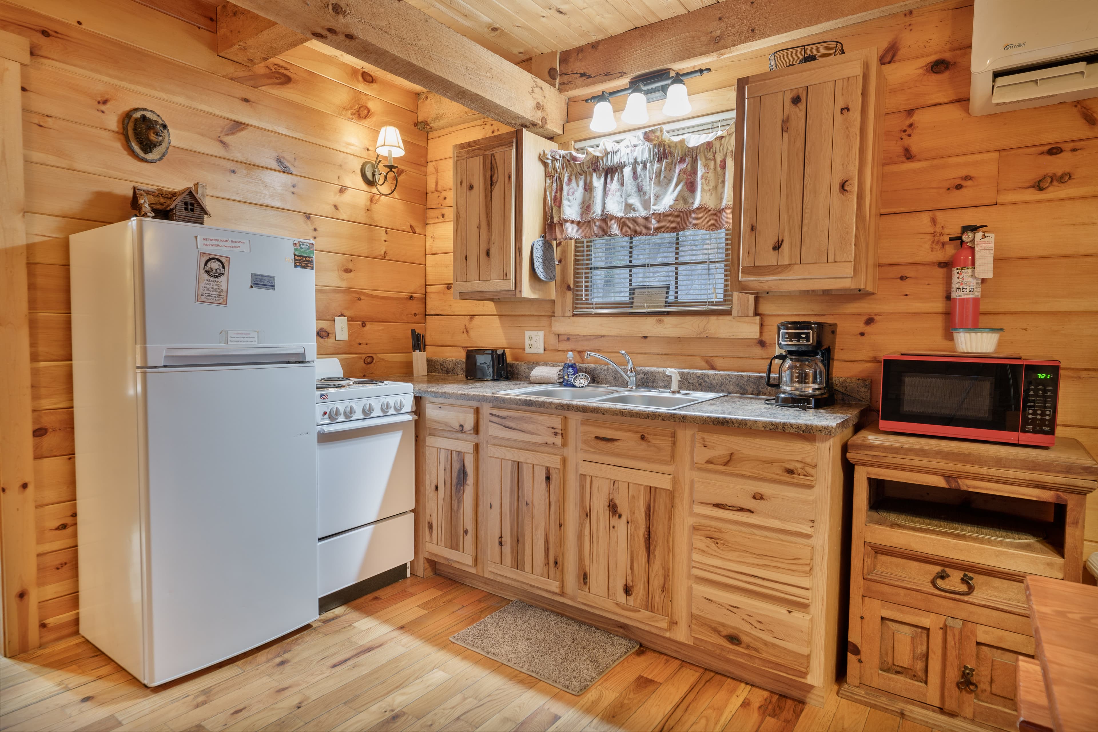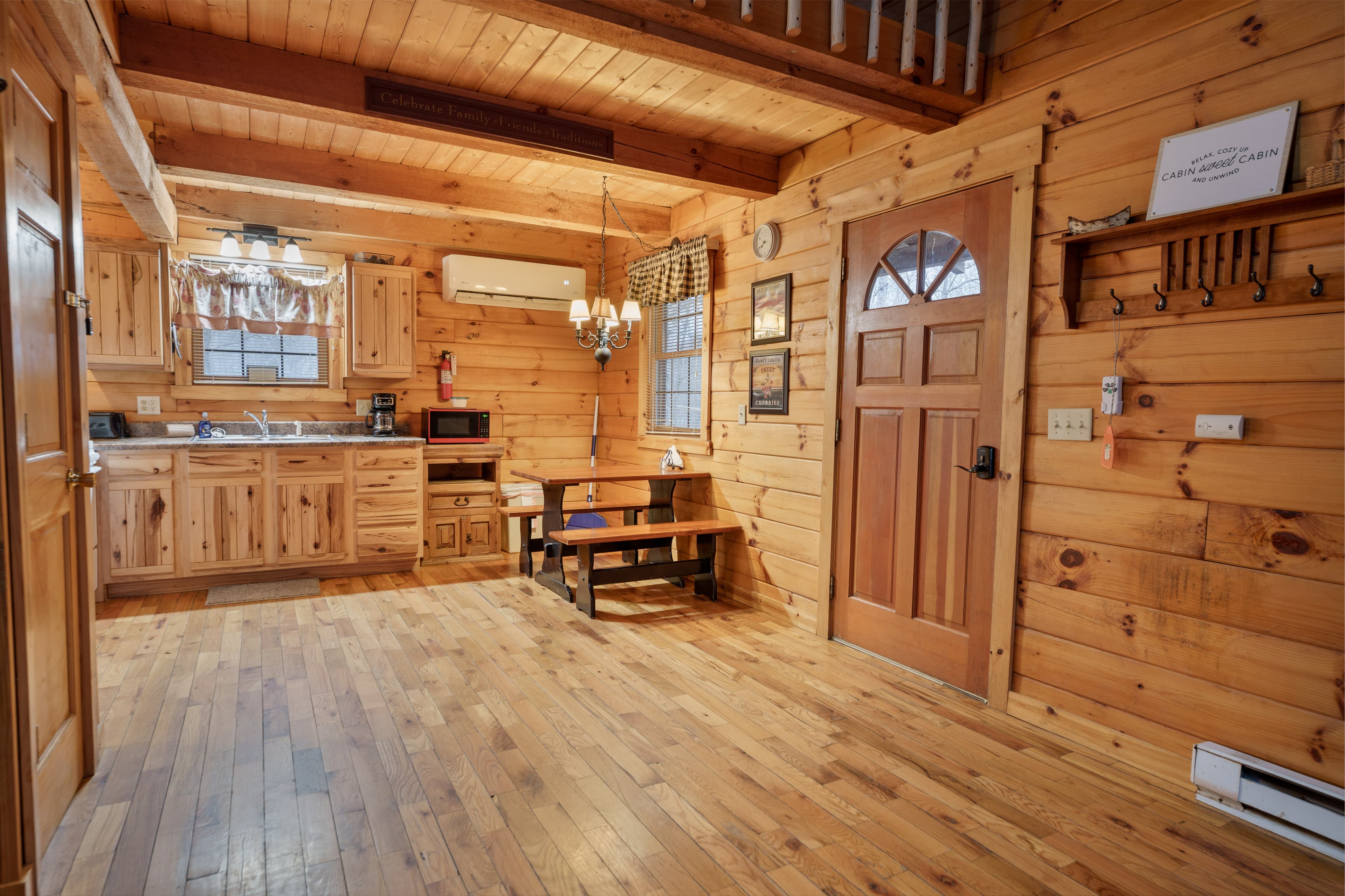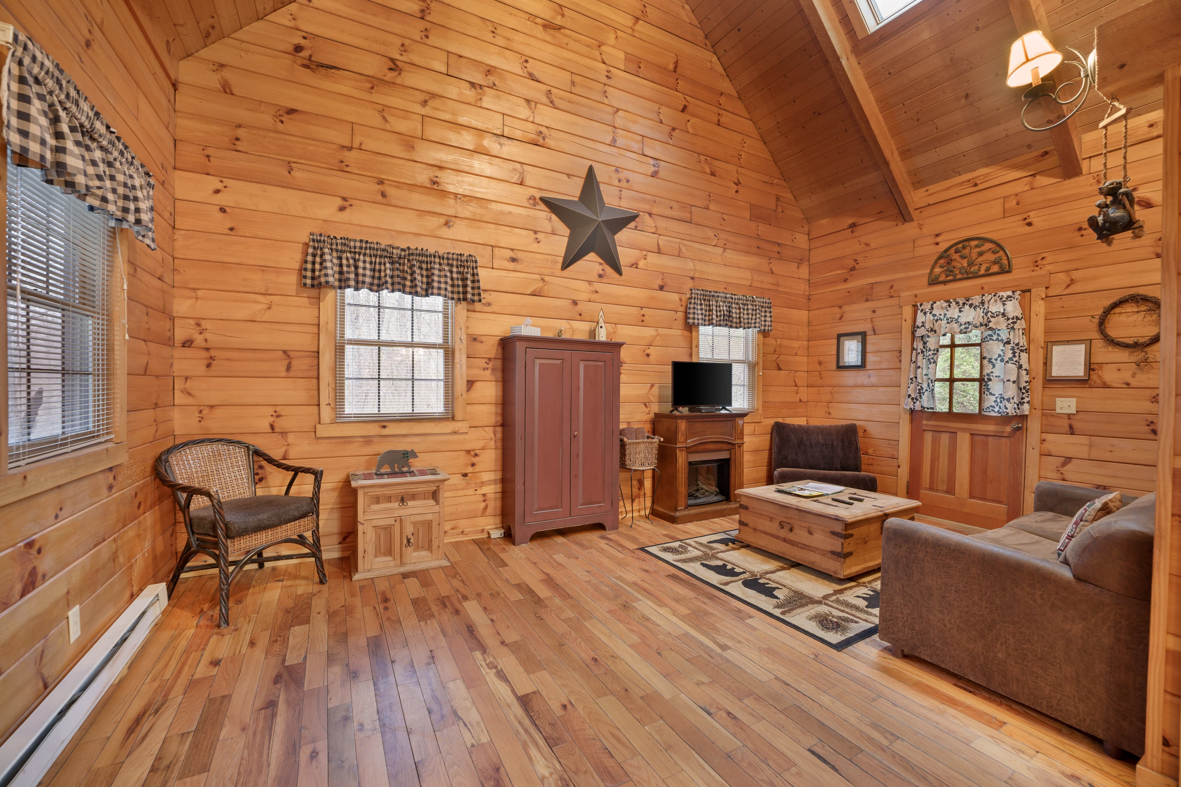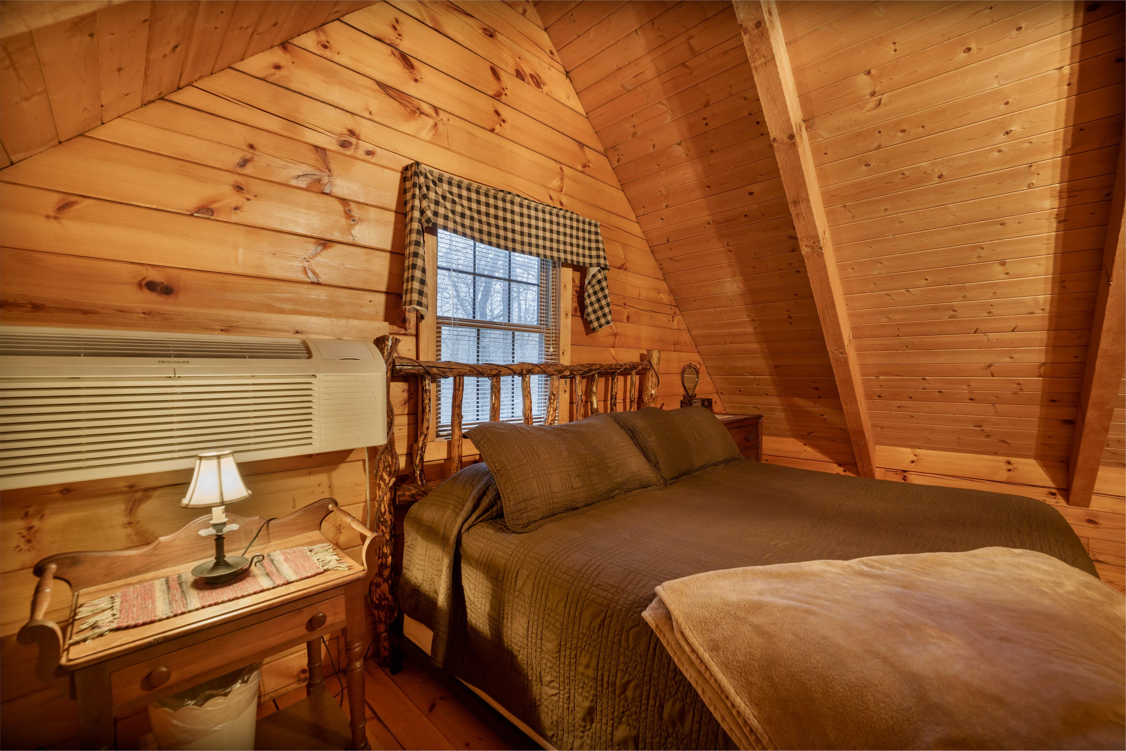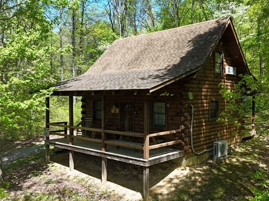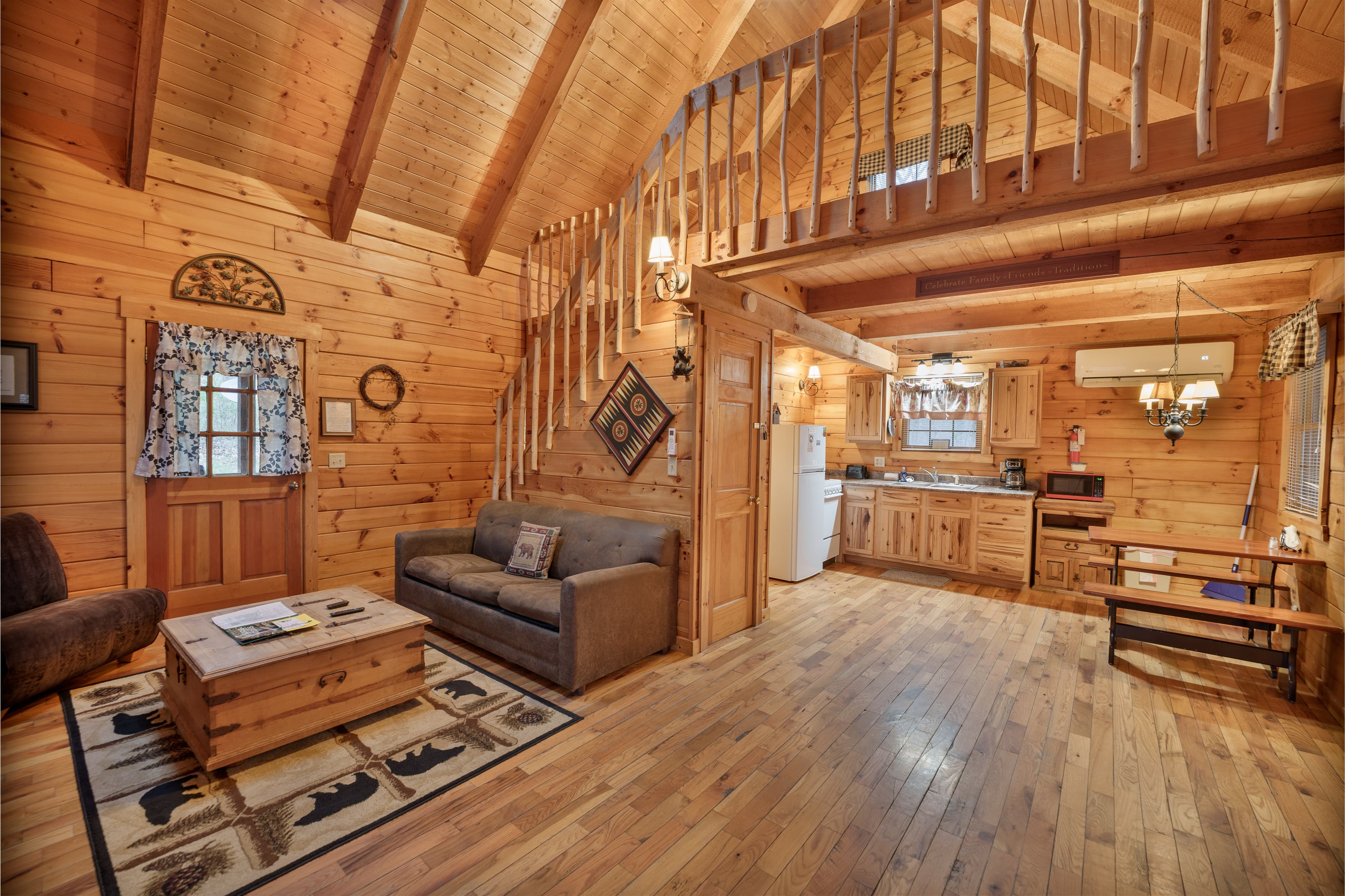 PET FRIENDLY. The Bear's Den is a one room log cabin with an open loft. The cabin sleeps four guests with king bed in the loft and a queen pullout sofa in the living space. It has a hot tub, wall Heat/AC, electric fireplace, Wifi with Smart TV and streaming only, fire pit and a gas grill. NOTE: Four-wheel drive is recommended if available and is required in inclement weather.