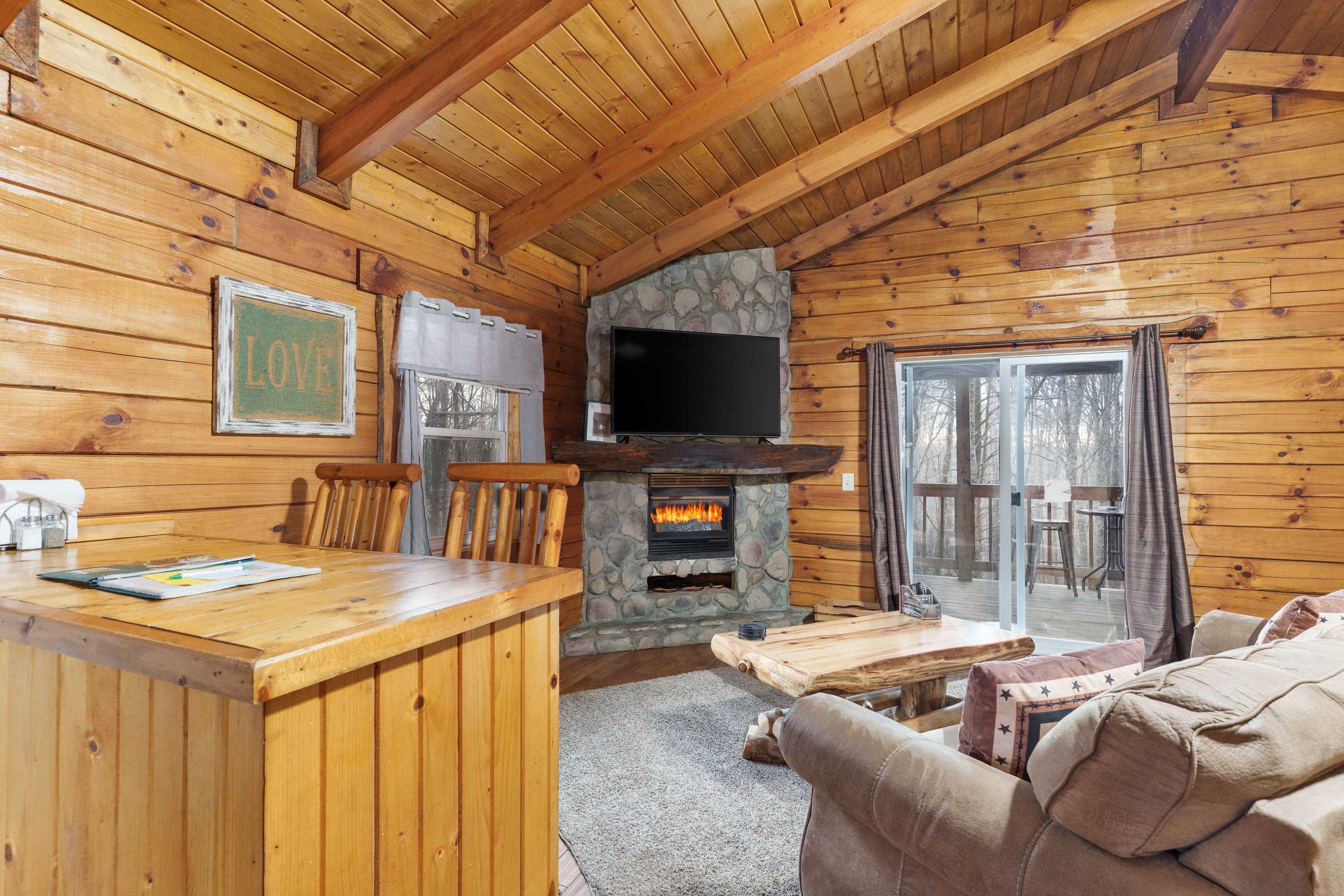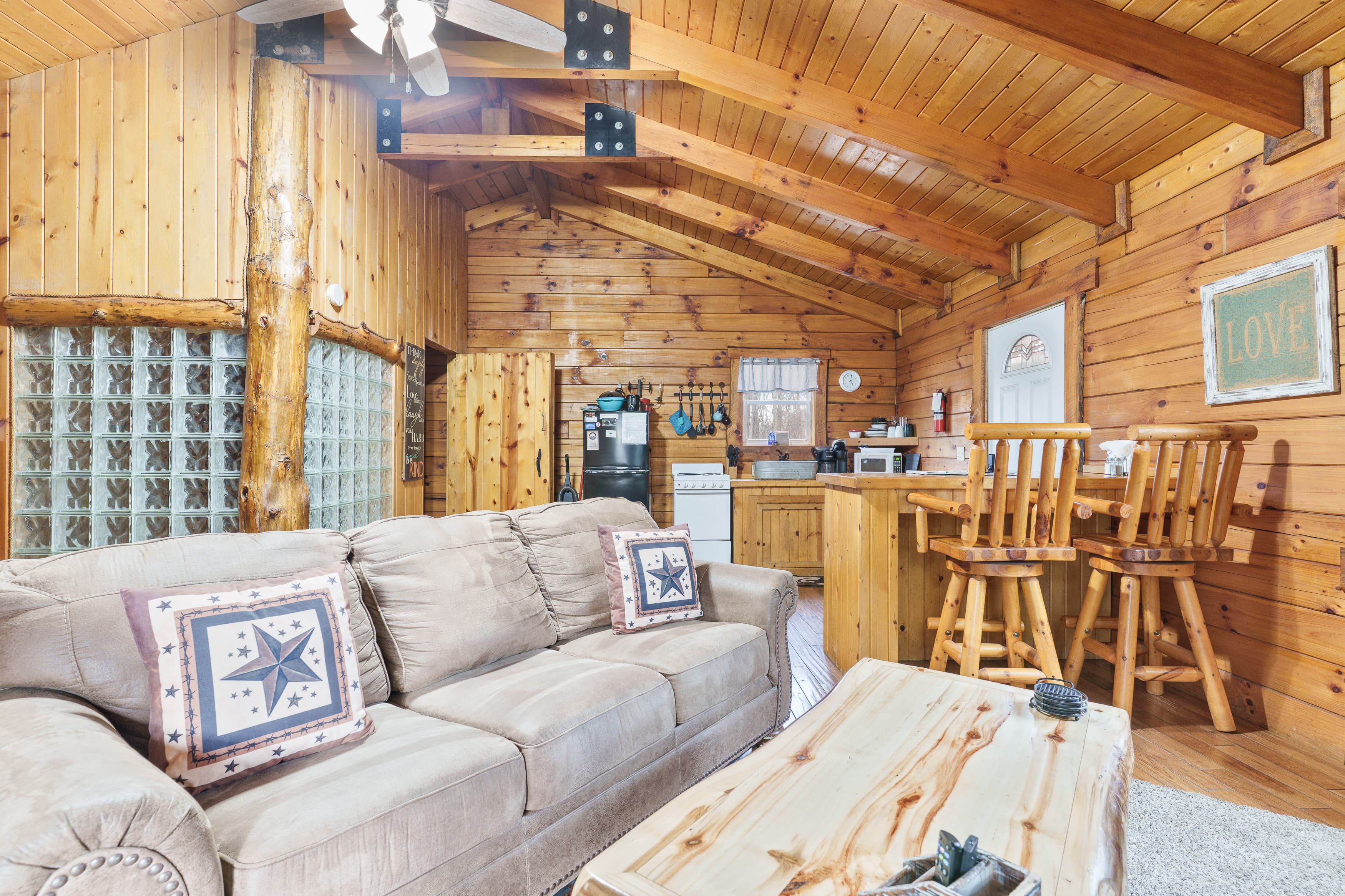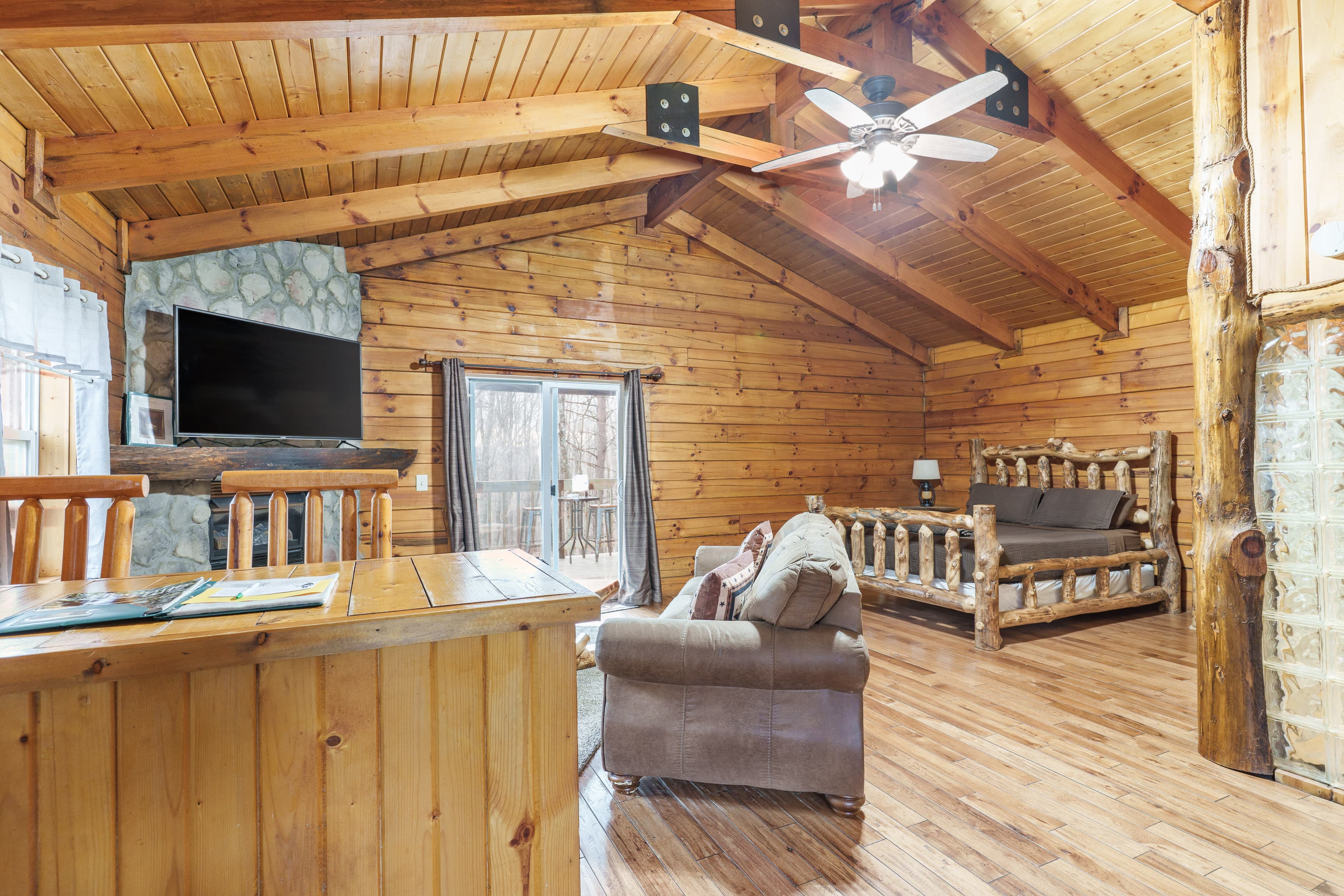 NOT PET FRIENDLY. Open floor plan two person cabin with a beautiful large glass block walk in shower and stone gas fireplace. It also has an amazing hand made aspen queen bed with a matching dresser, coffee table and sofa. Hot tub and gas grill on the deck. Keurig Duo for your morning brew.