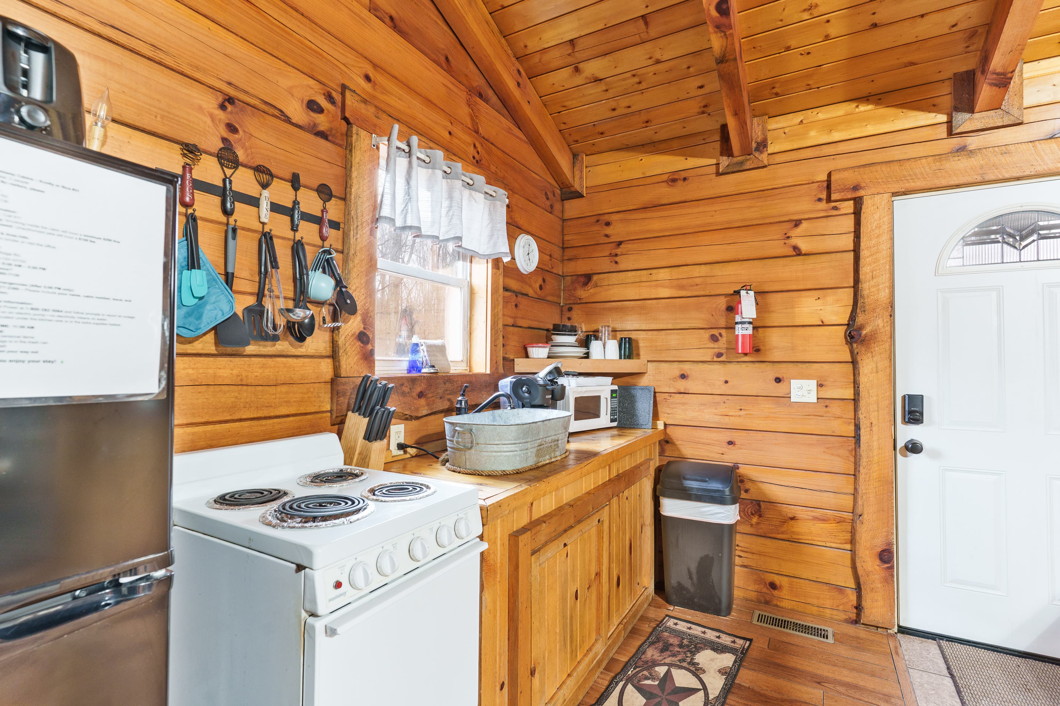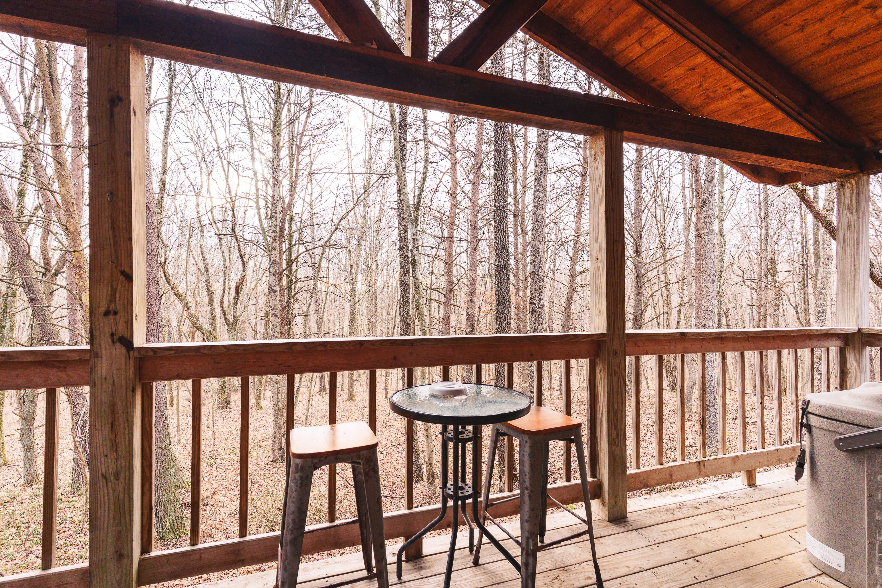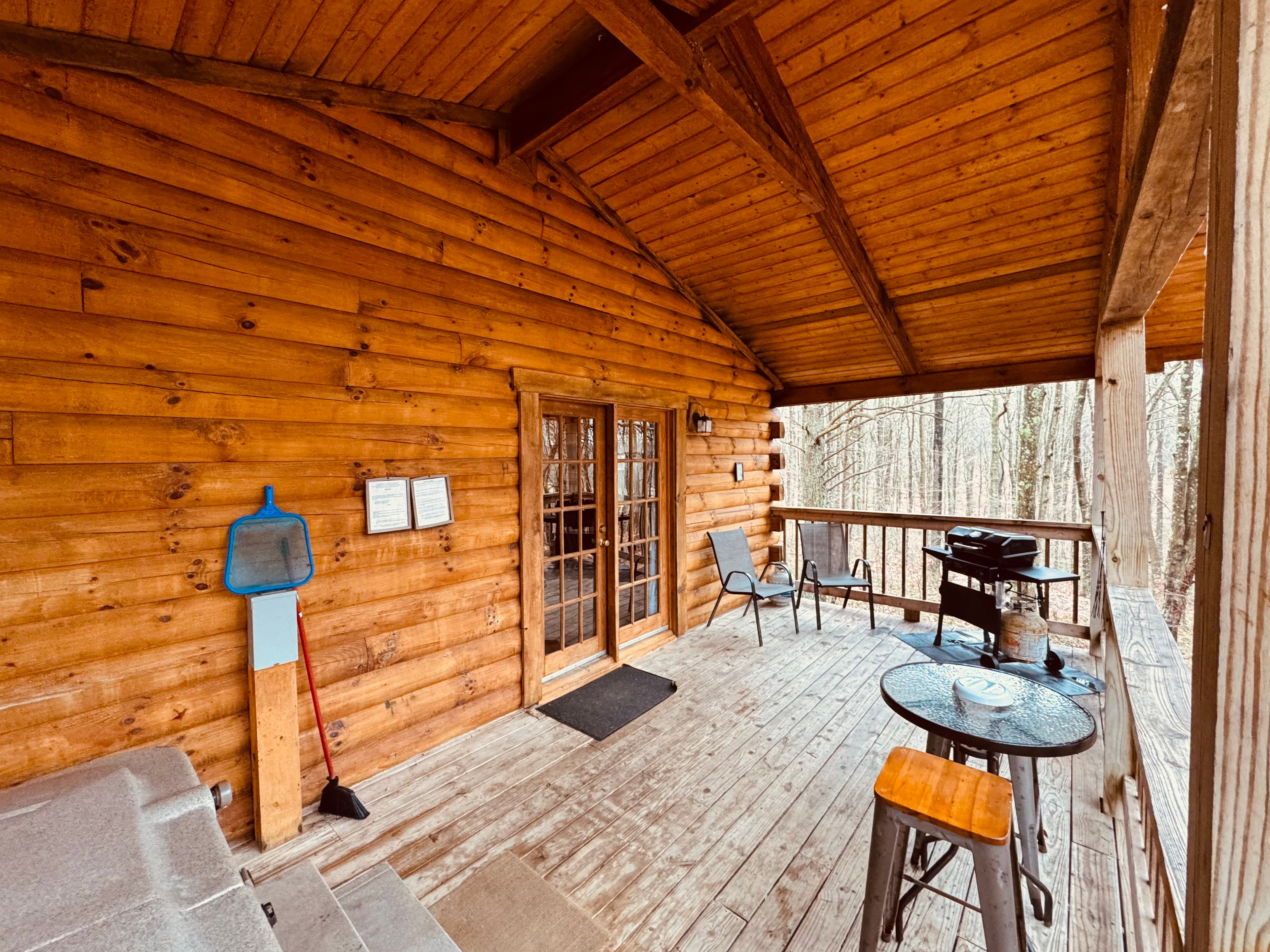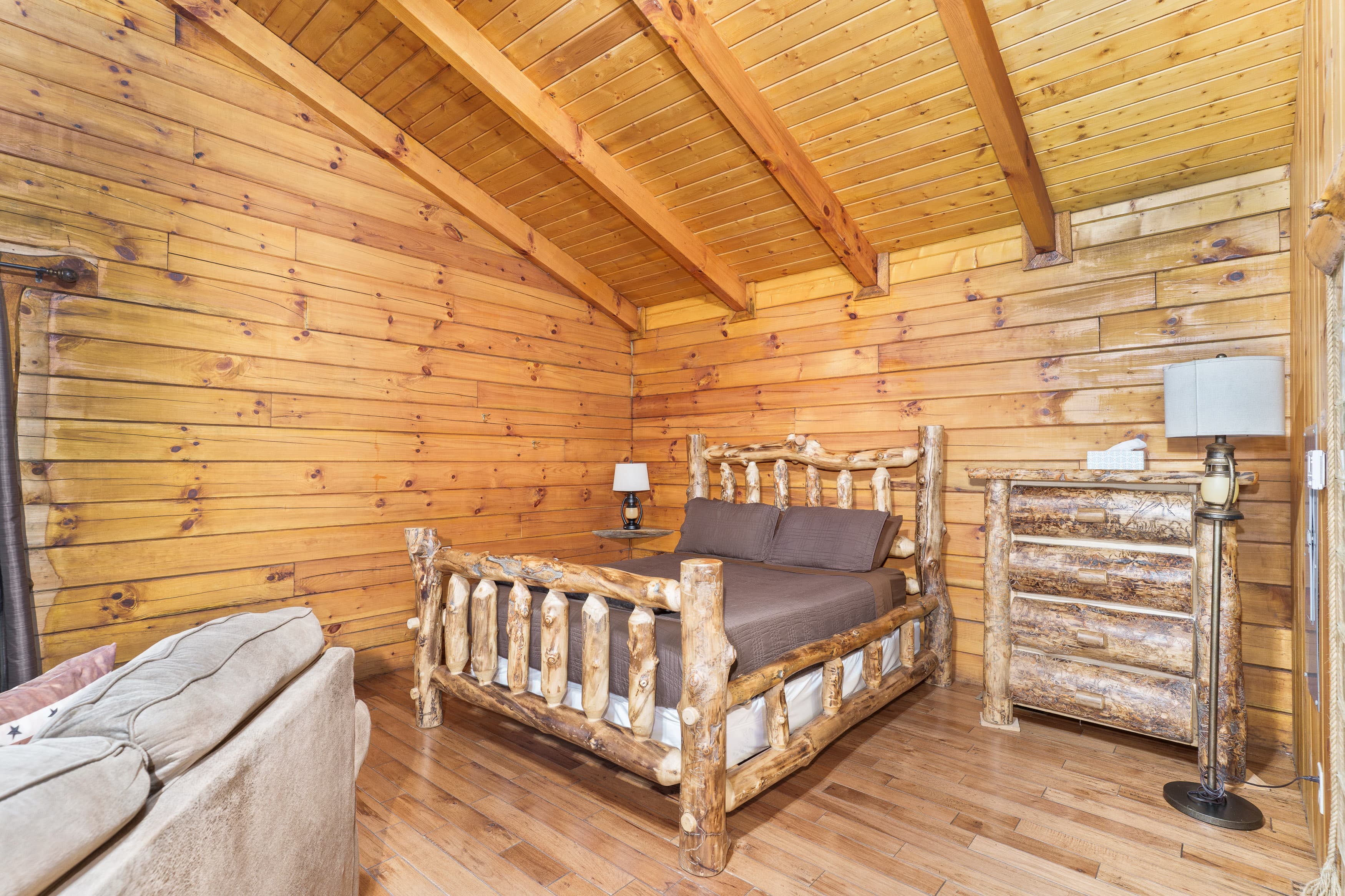 NOT PET FRIENDLY. Open floor plan two person cabin with a beautiful large glass block walk in shower and stone gas fireplace. It also has an amazing hand made aspen queen bed with a matching dresser, coffee table and sofa. Hot tub and gas grill on the deck. Keurig Duo for your morning brew.