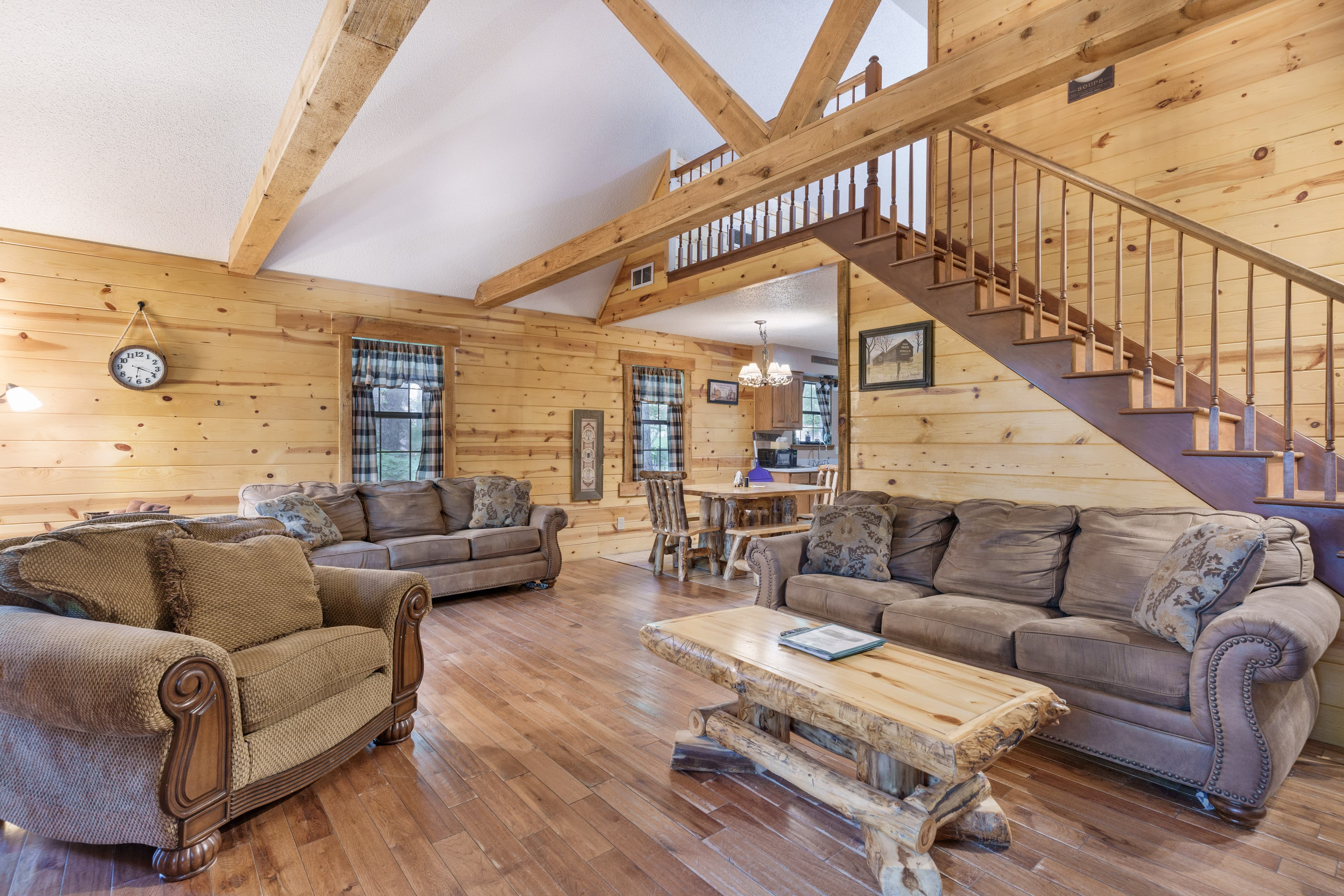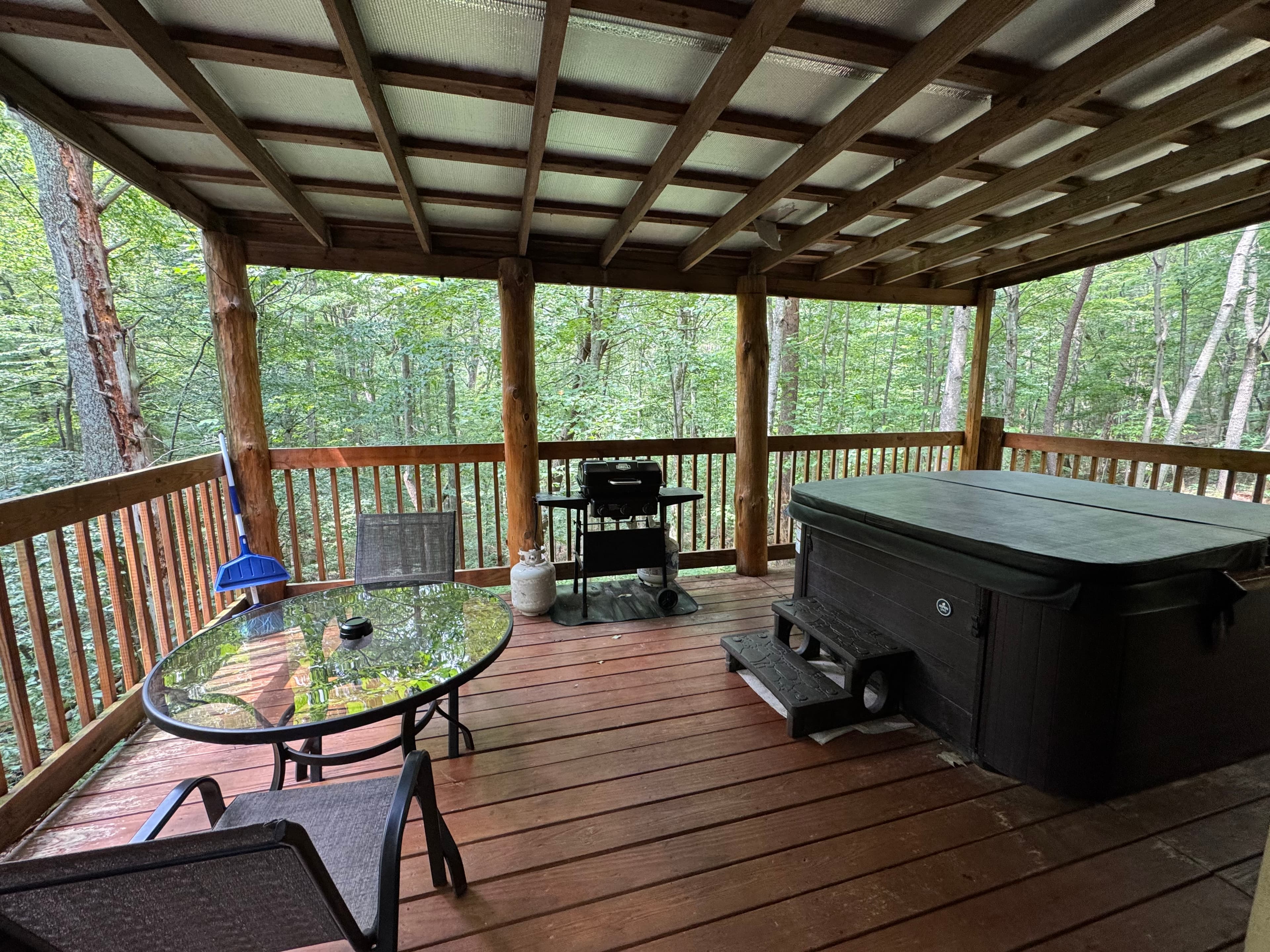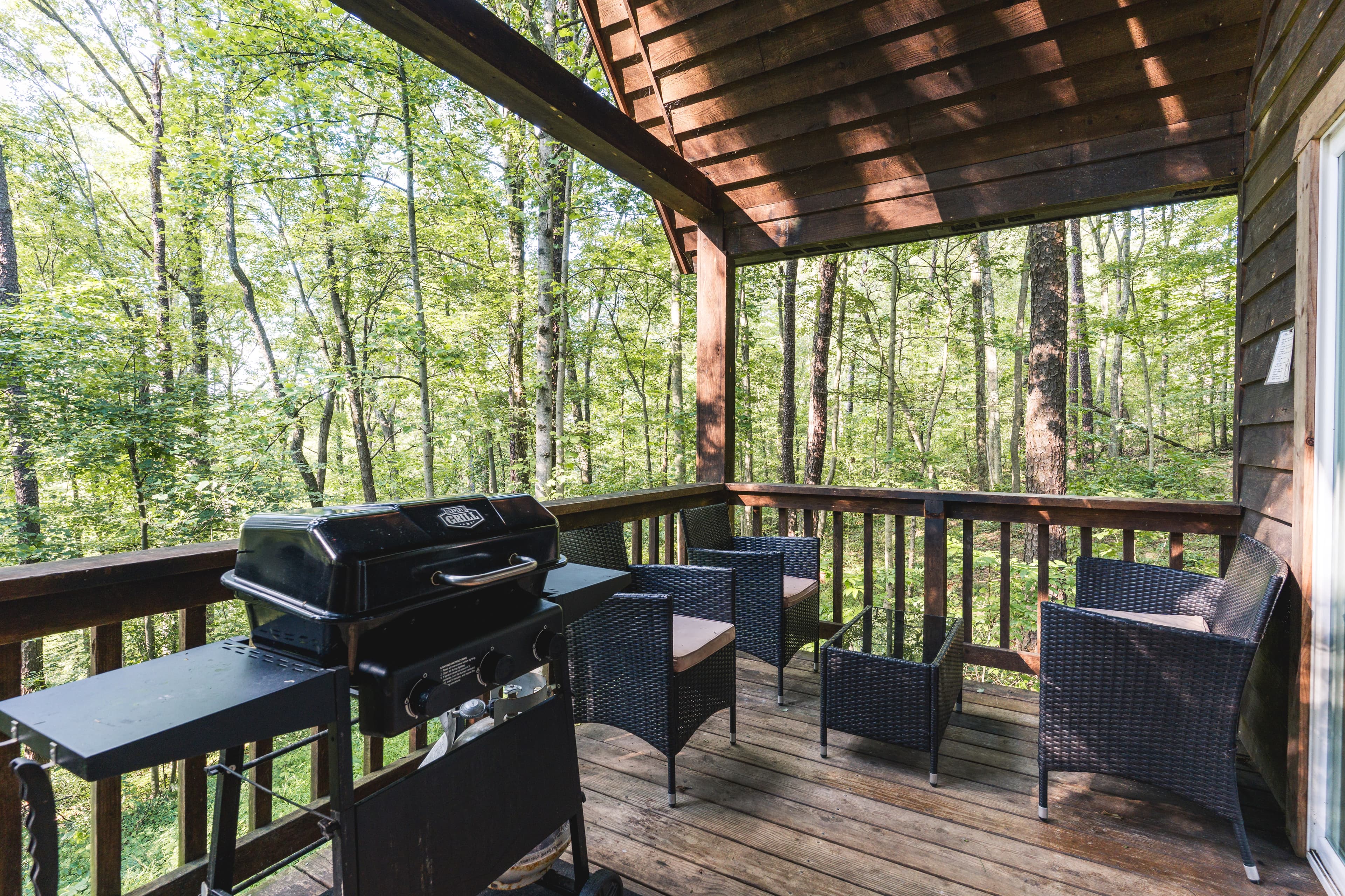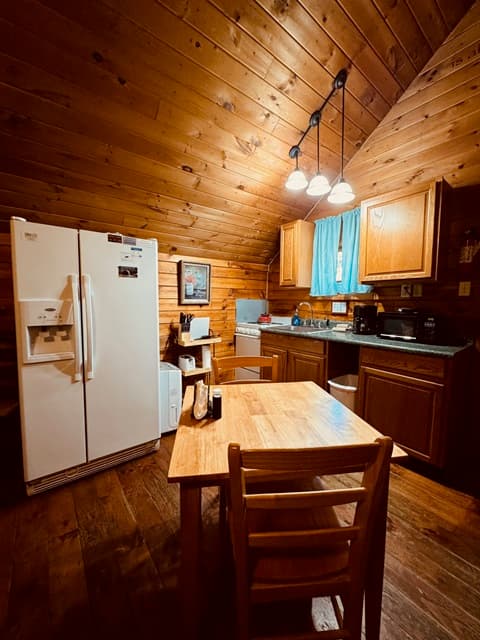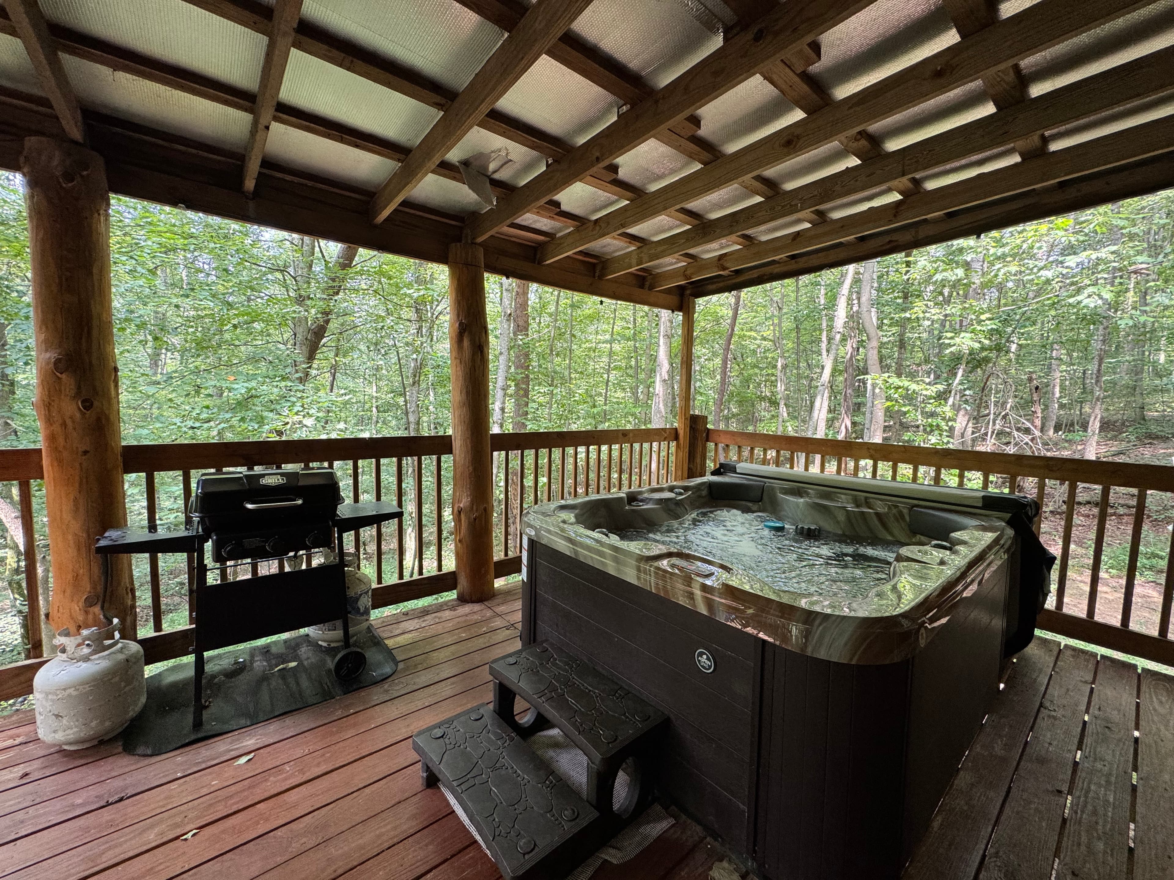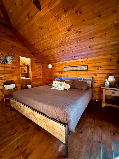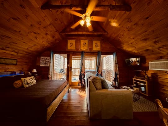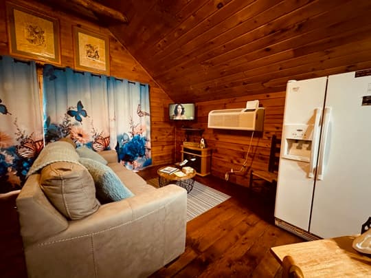 PET FRIENDLY. Enchanted is a cedar cabin on our Ash Cave property. The first floor of the cabin is handicap accessible with large walk in shower. Beautiful hand made aspen furniture throughout. Equipped with Starlink WIFI and a Smart TV with streaming only. The main floor has a private Queen size bedroom. Their is a King size bed in loft and two queen pull out sofa bed's in the living area for additional sleeping. The living area also has a wood burning fireplace for enjoyment in the colder months. The standard kitchen is stocked and has a Keurig Duo. The back deck offers a large hot tub, gas grill and seating. 4 wheel drive recommended/required in inclement and winter weather. This cabin is walking distance to our Ash Cave Day Spa, convention center and gardens.