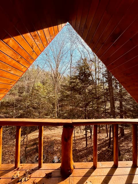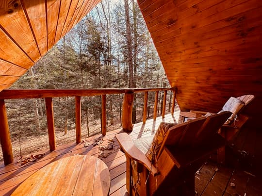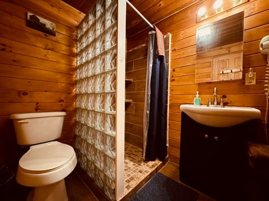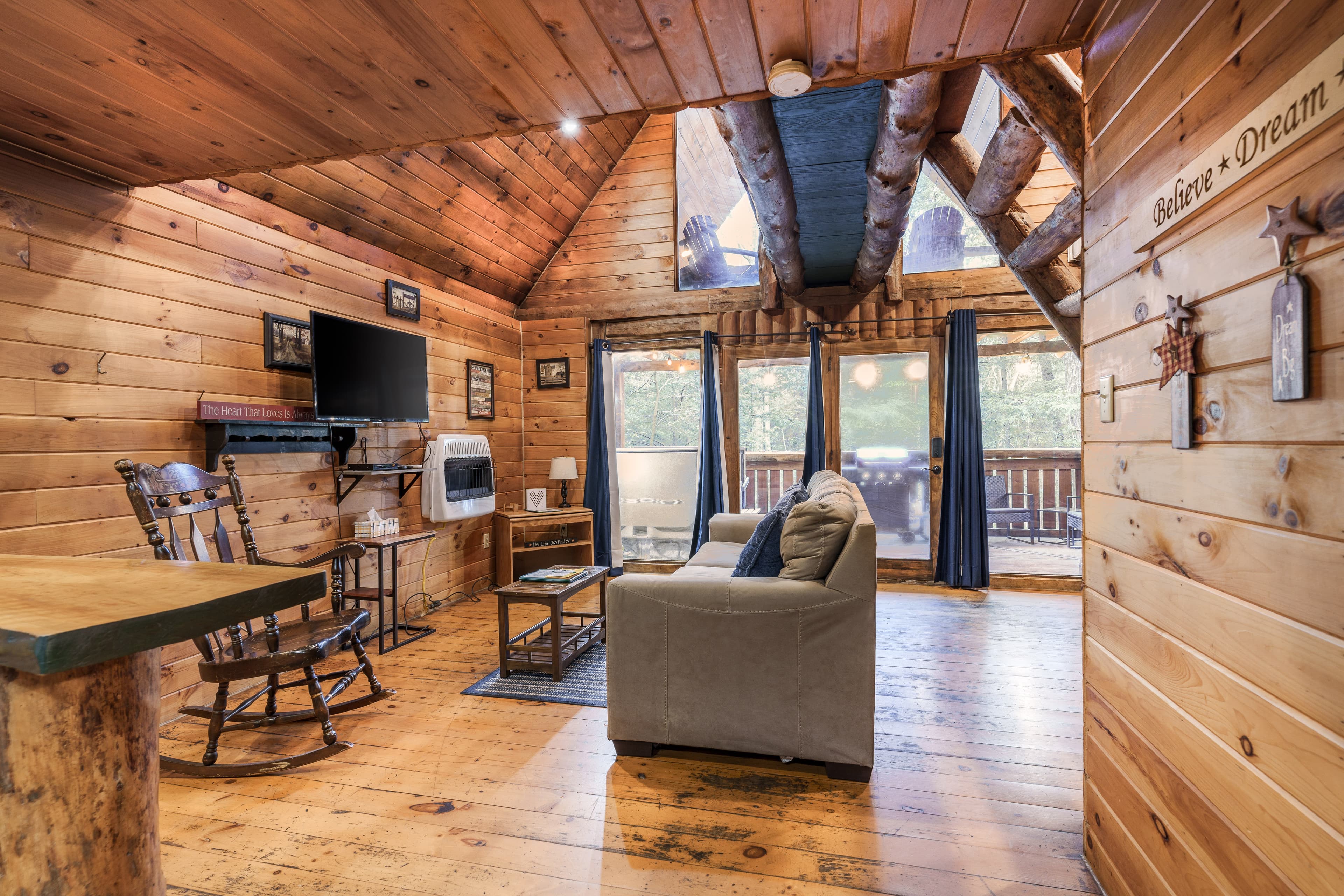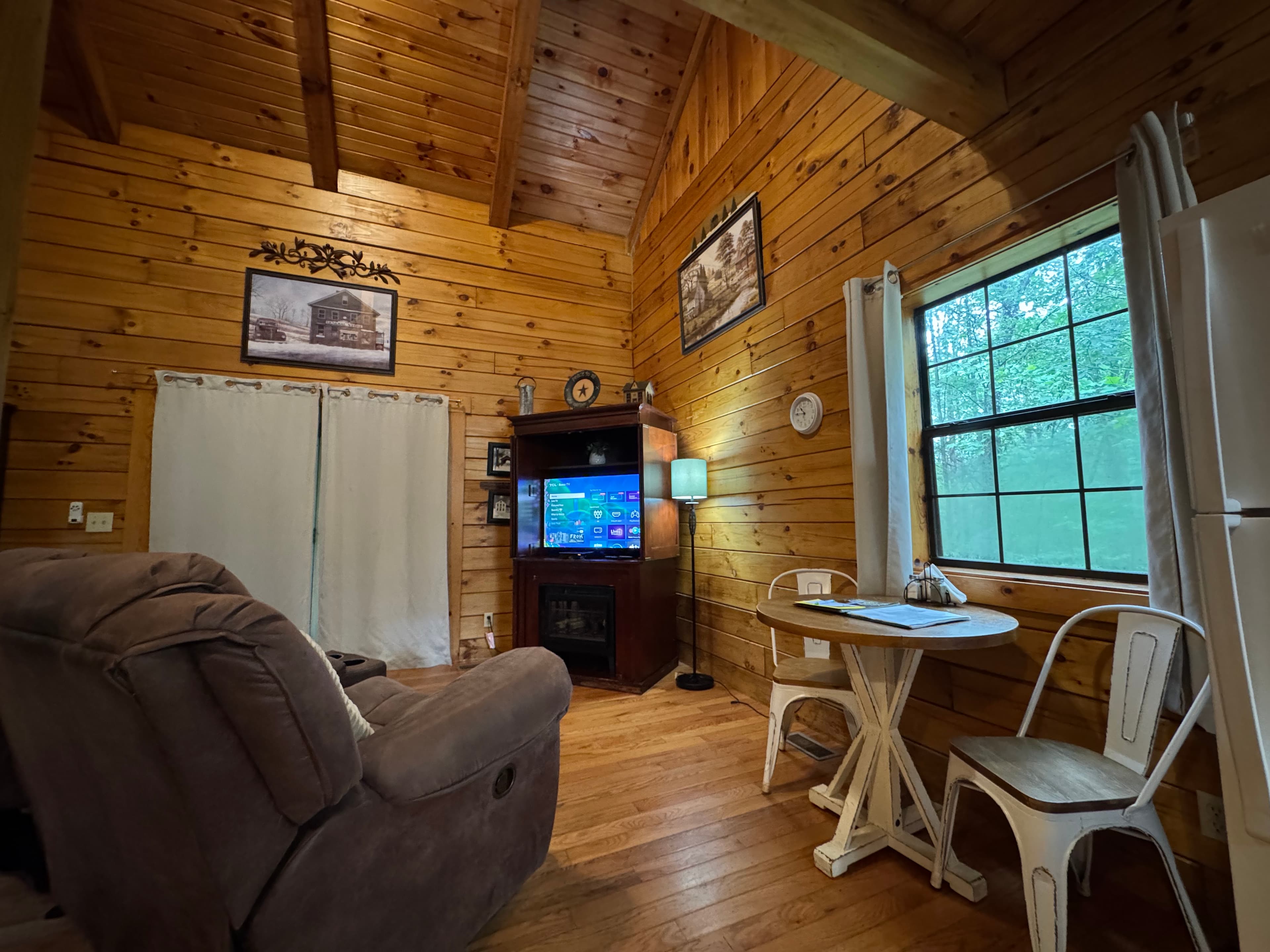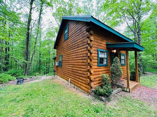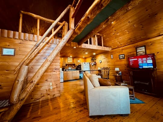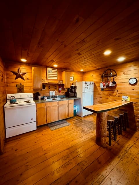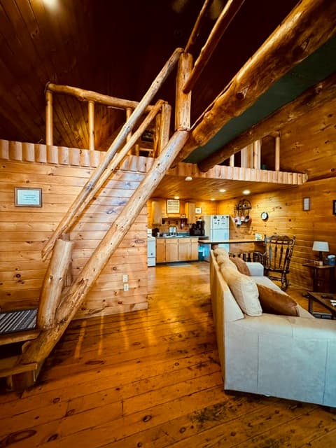 PET FRIENDLY. The Shawnee is a one bedroom cabin but has the capacity to fit 4 guests comfortably. There is a King bed in the private bedroom, and queen pull-out sofa in the living room. Other amenities for this cabin include a large hot tub, gas grill, satellite TV with DVD, air conditioning, electric fireplace, standard kitchen appliances and a Keurig coffee maker. This cabin is also great for animal lovers as it has a wildlife feeding station.