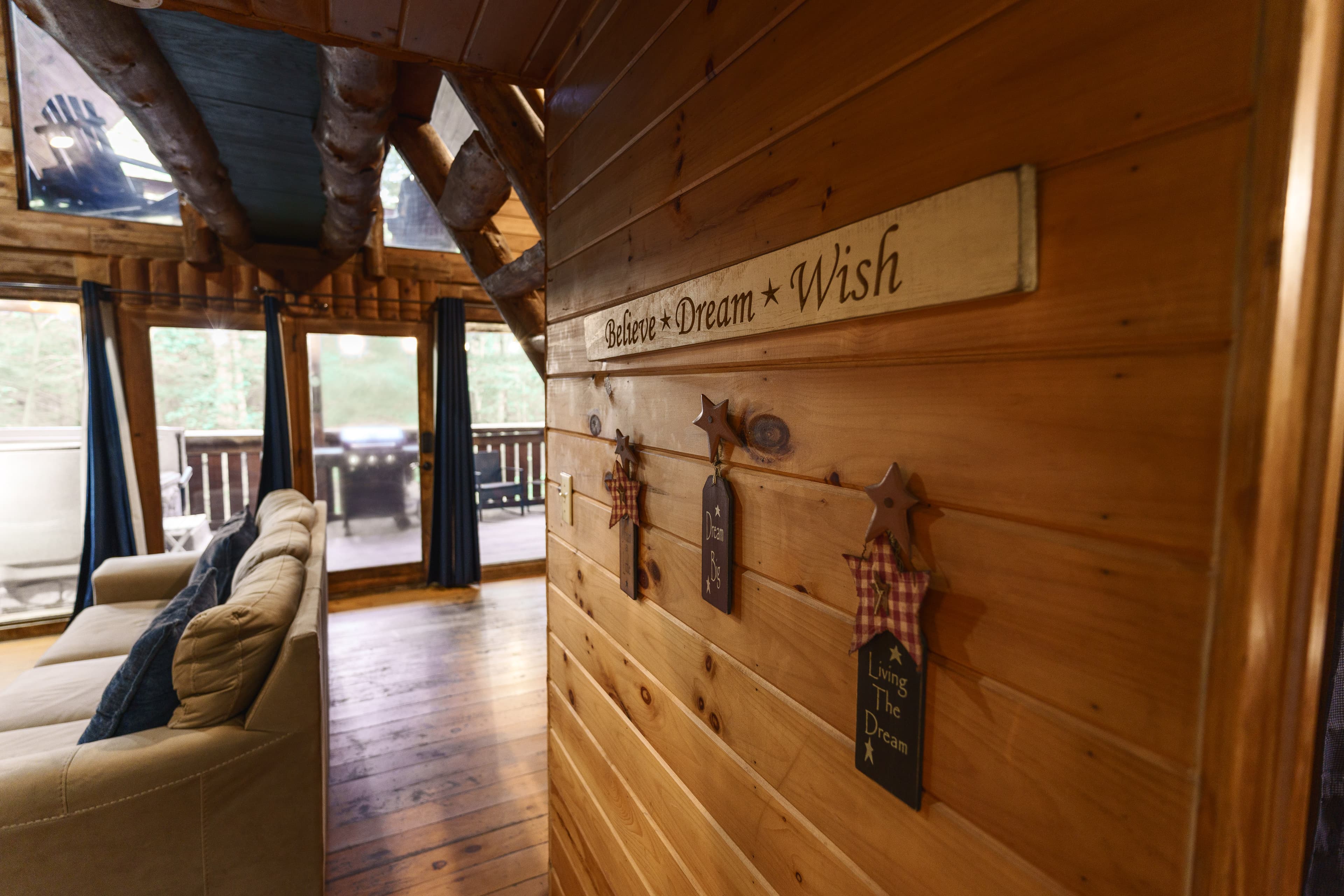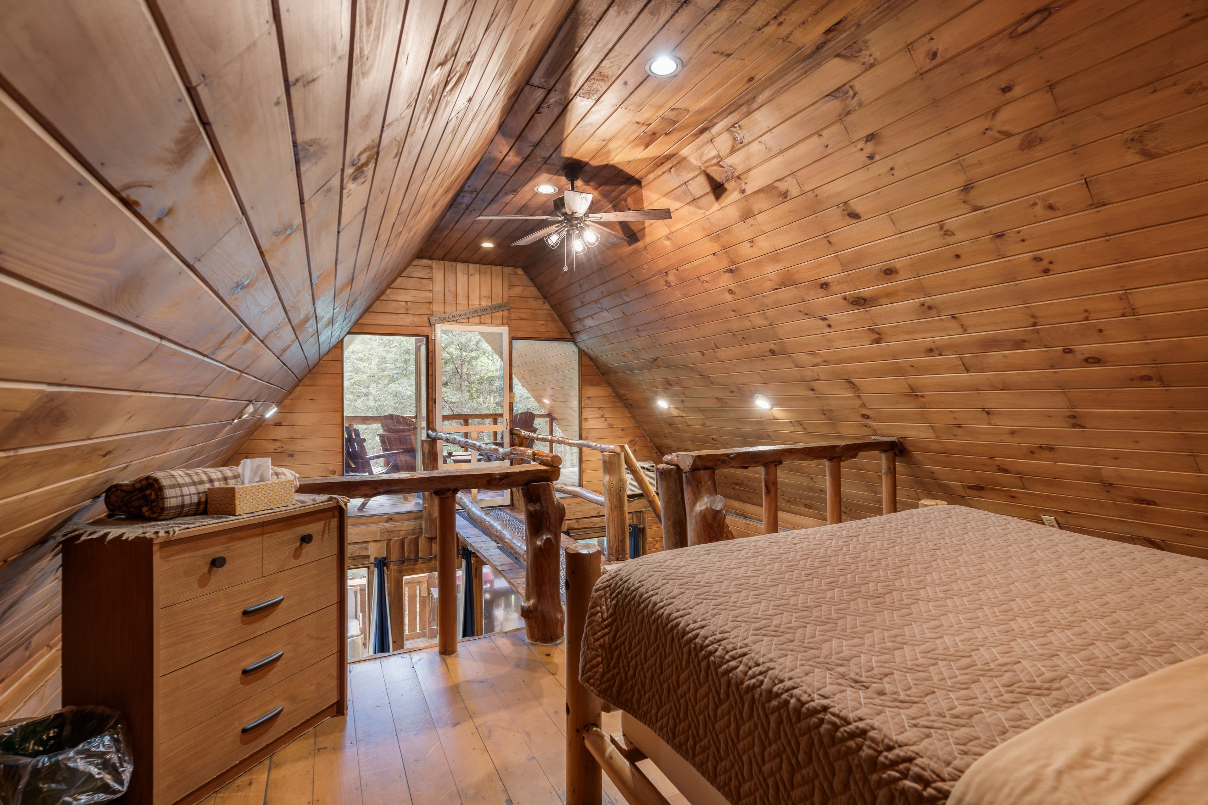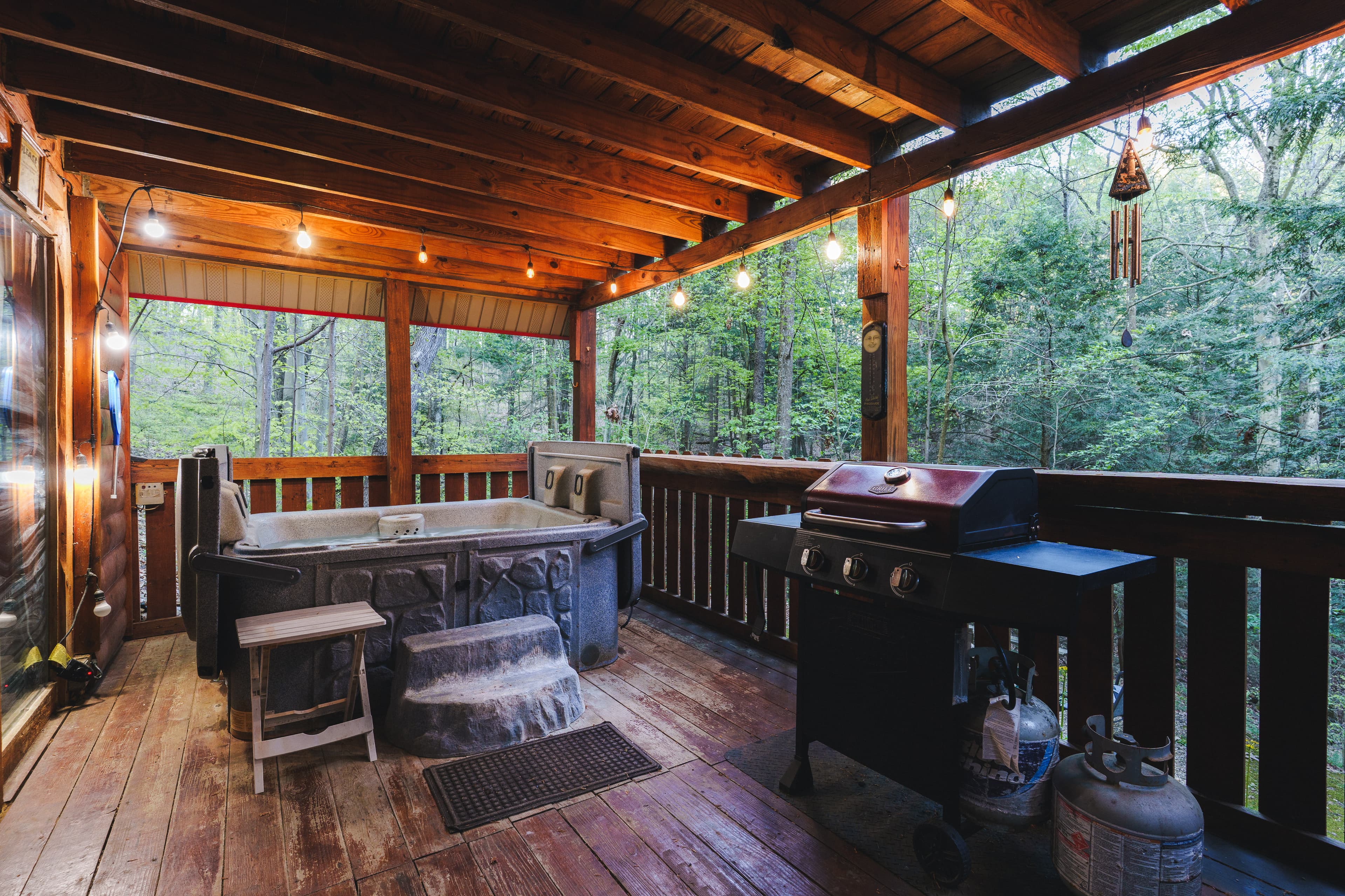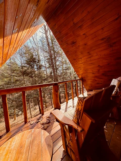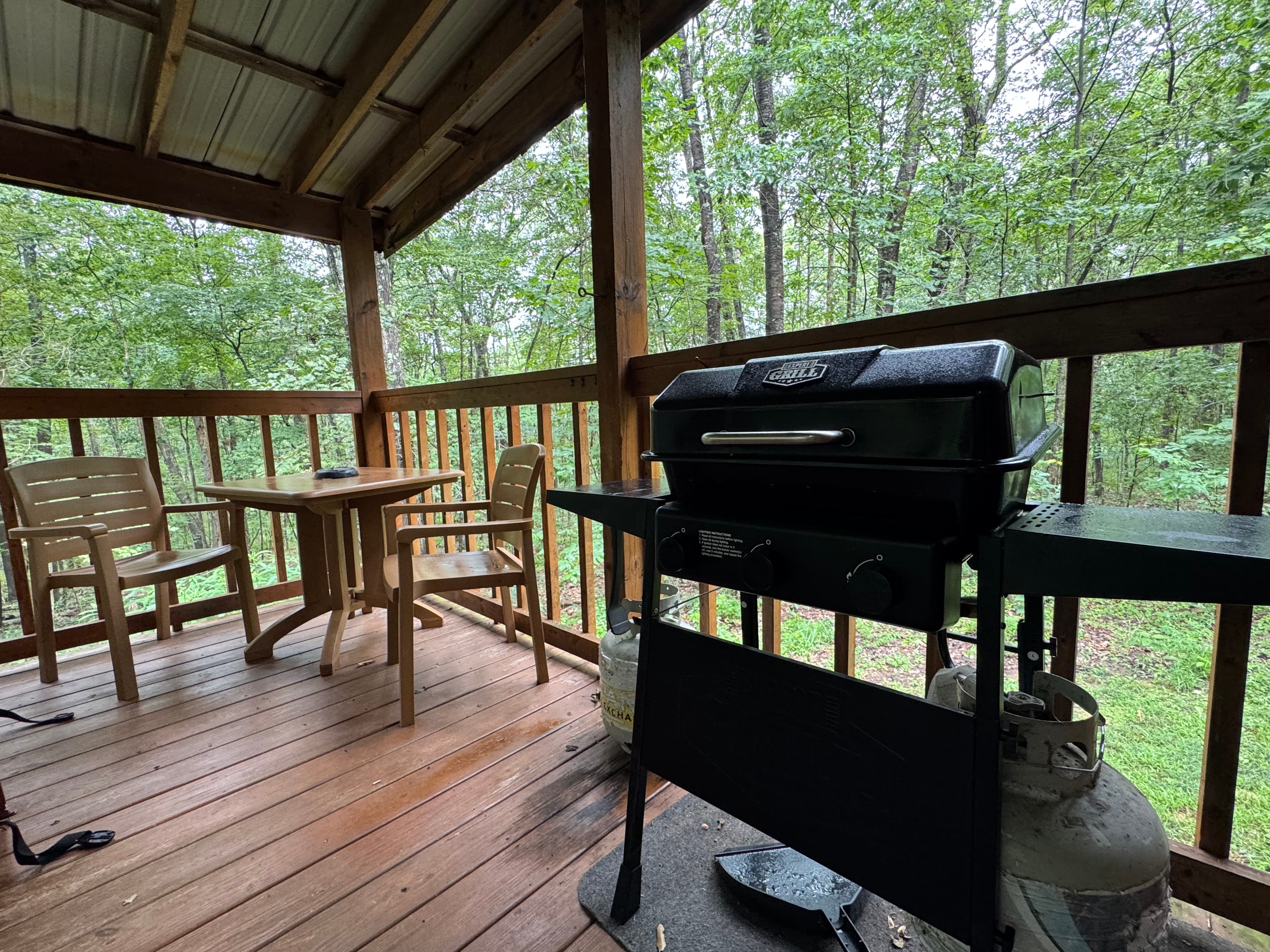 PET FRIENDLY. The Shawnee is a one bedroom cabin but has the capacity to fit 4 guests comfortably. There is a King bed in the private bedroom, and queen pull-out sofa in the living room. Other amenities for this cabin include a large hot tub, gas grill, satellite TV with DVD, air conditioning, electric fireplace, standard kitchen appliances and a Keurig coffee maker. This cabin is also great for animal lovers as it has a wildlife feeding station.