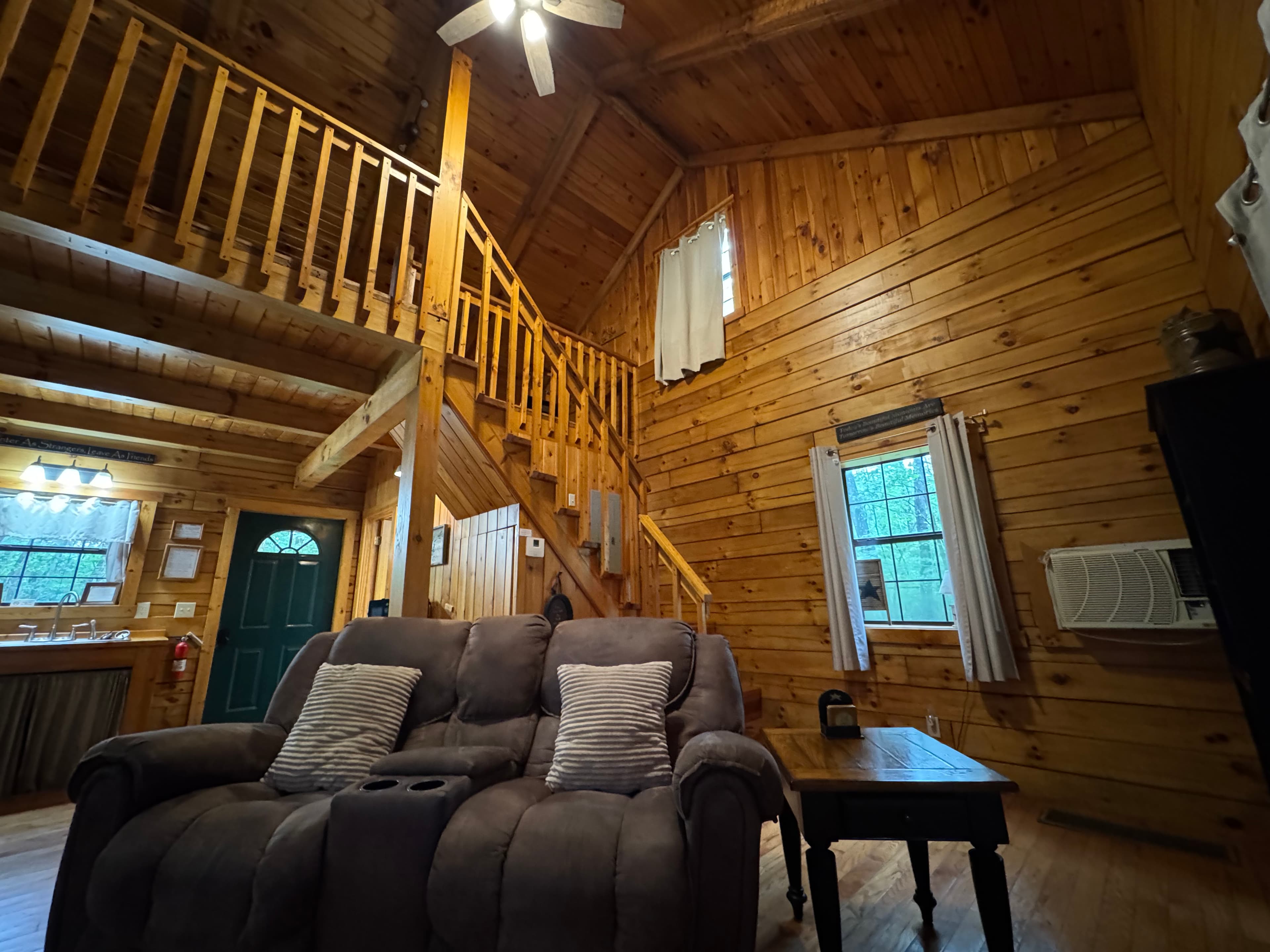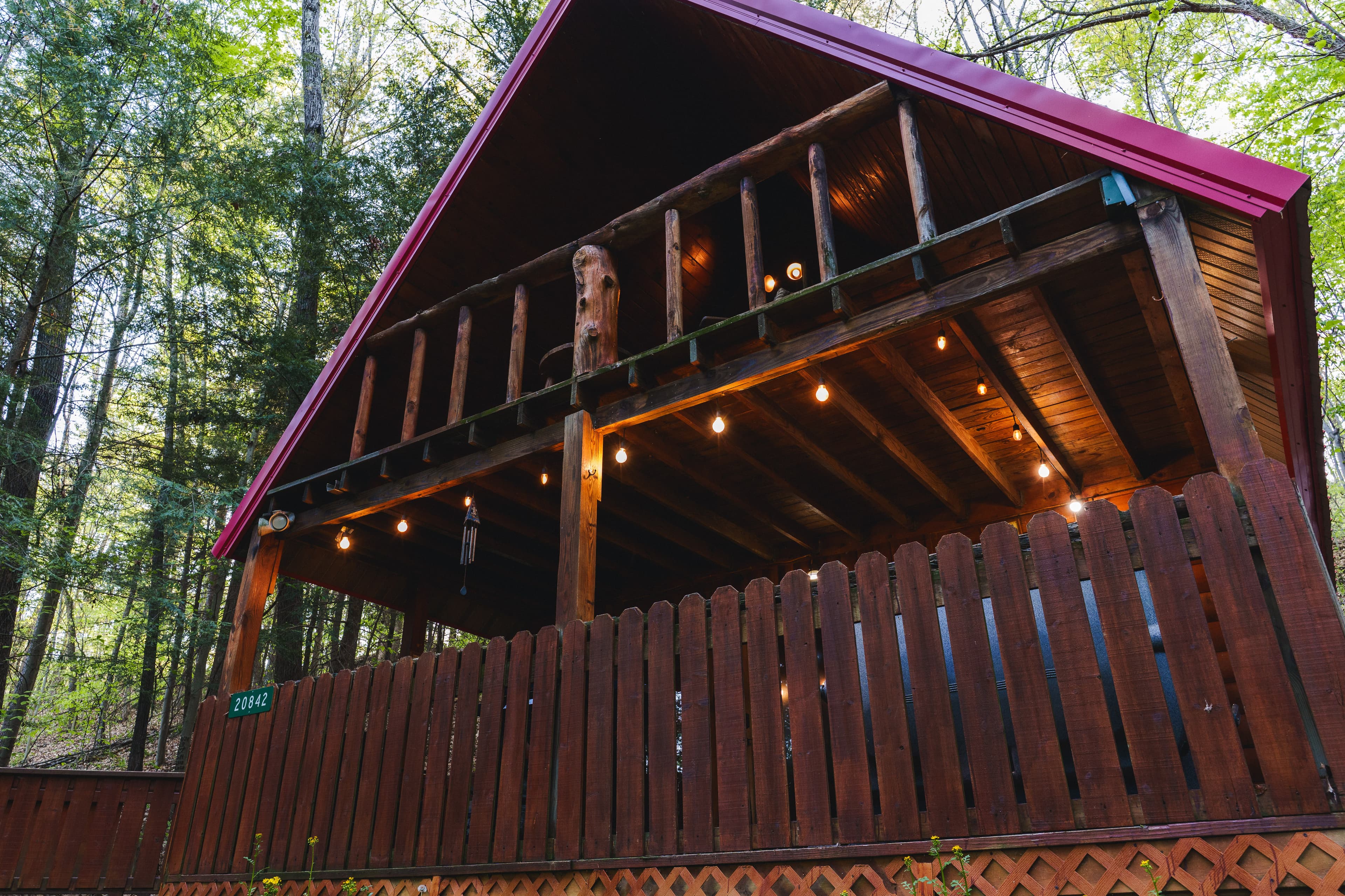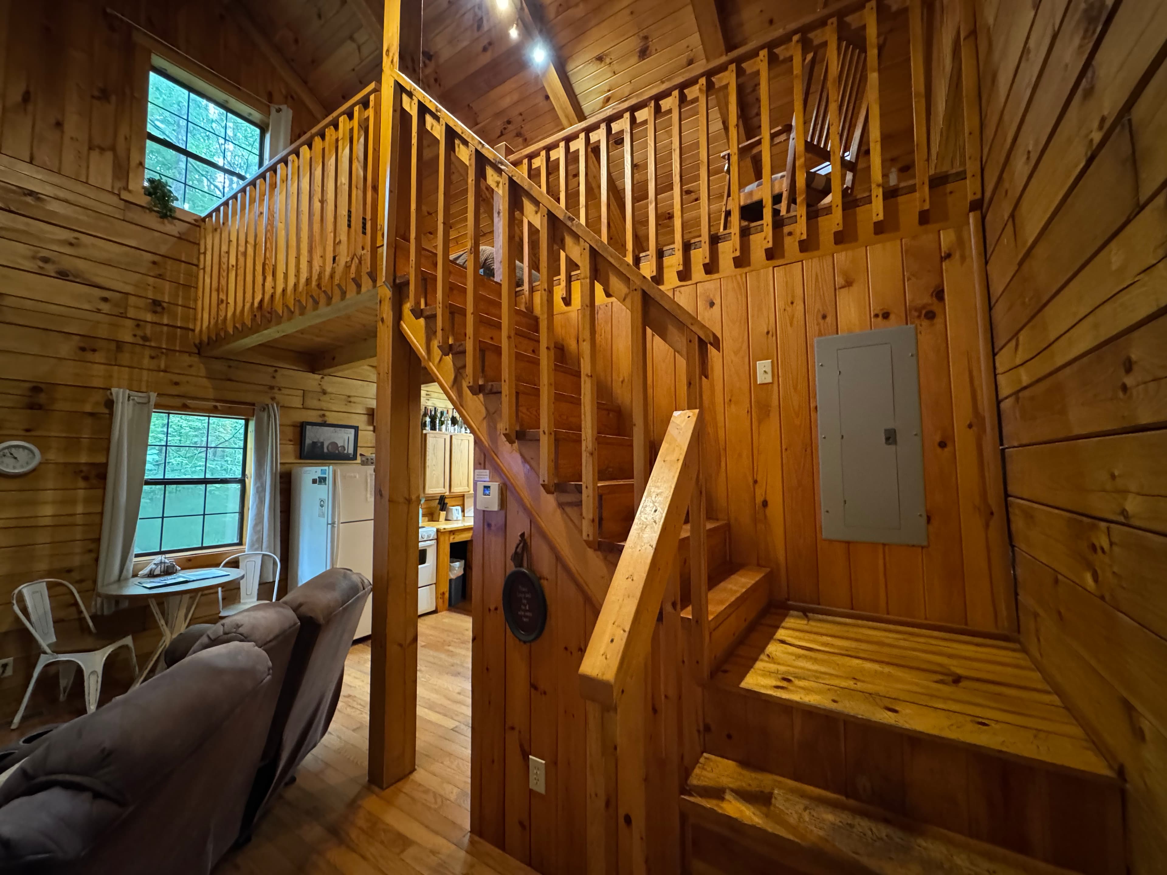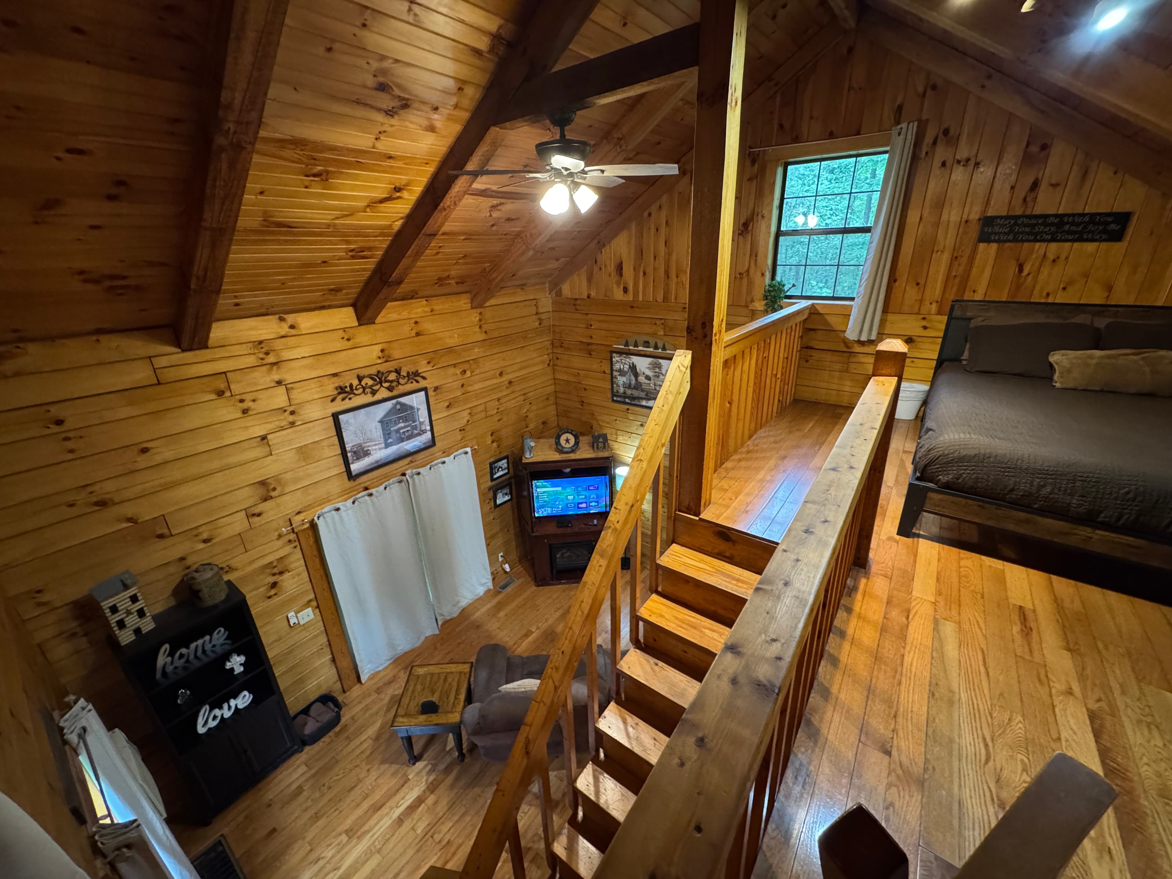 PET FRIENDLY. The Shawnee is a one bedroom cabin but has the capacity to fit 4 guests comfortably. There is a King bed in the private bedroom, and queen pull-out sofa in the living room. Other amenities for this cabin include a large hot tub, gas grill, satellite TV with DVD, air conditioning, electric fireplace, standard kitchen appliances and a Keurig coffee maker. This cabin is also great for animal lovers as it has a wildlife feeding station.