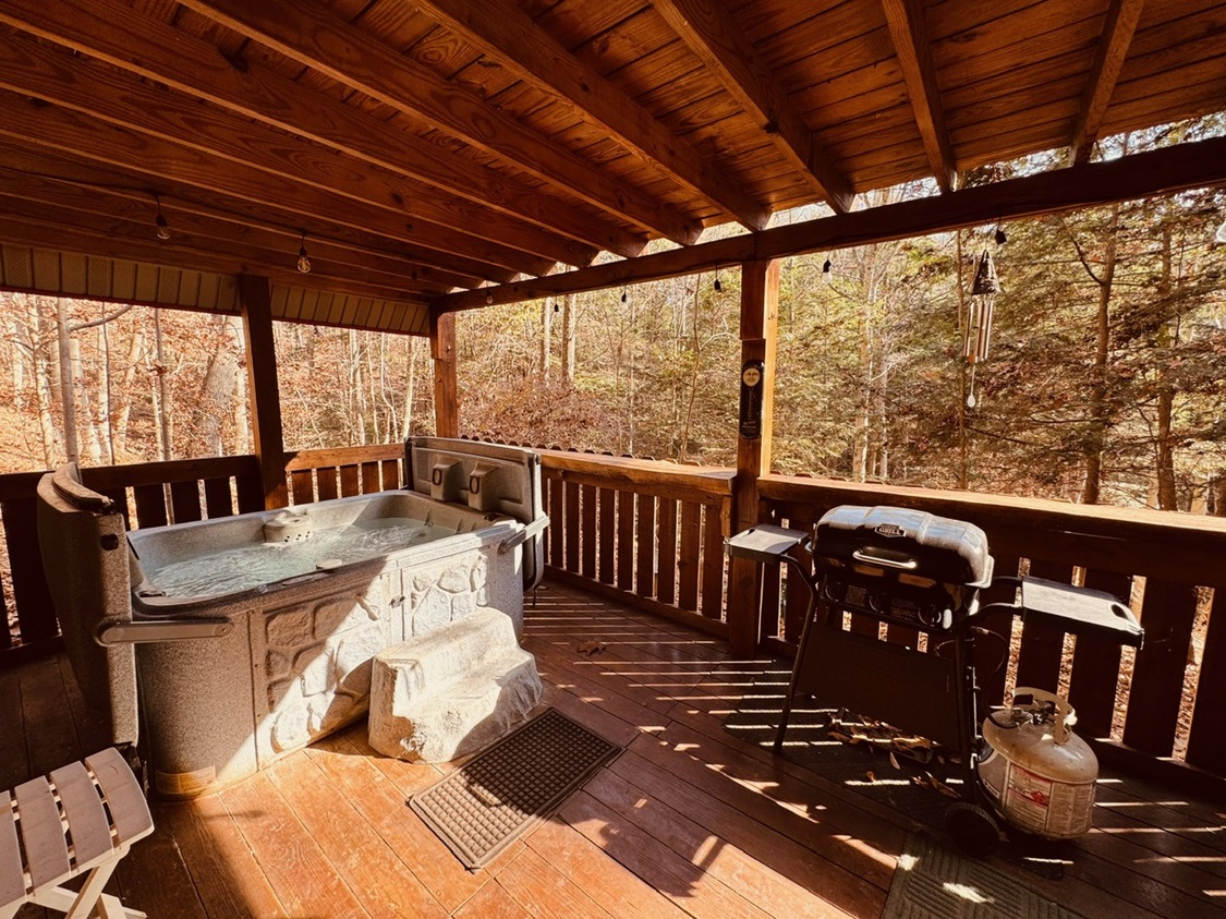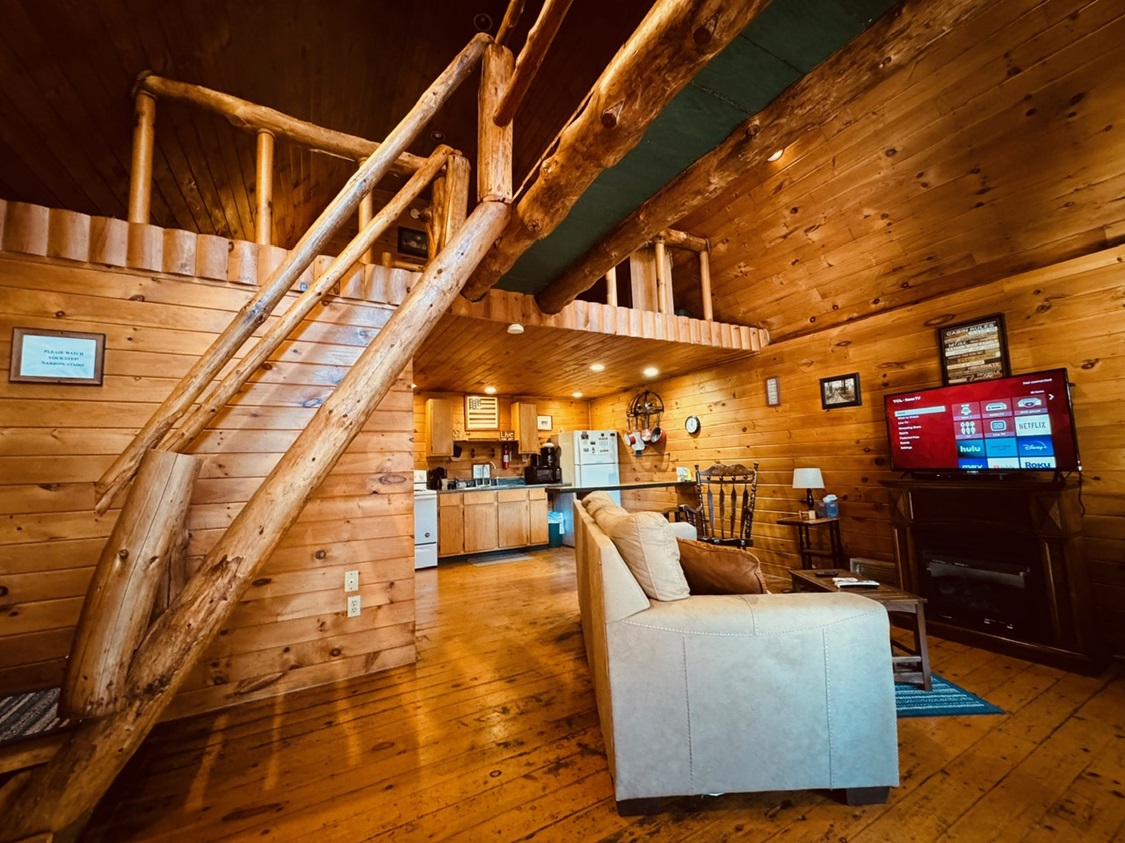 The Stargazer is a unique, loft style cabin that sleeps 2, with a hot tub, queen-size bed, Wifi with Roku Smart TV, gas powered fireplace, Tiled glass block shower, gas grill, towels, linens and a standard kitchen. NOTE: Four-wheel drive recommended in inclement weather.