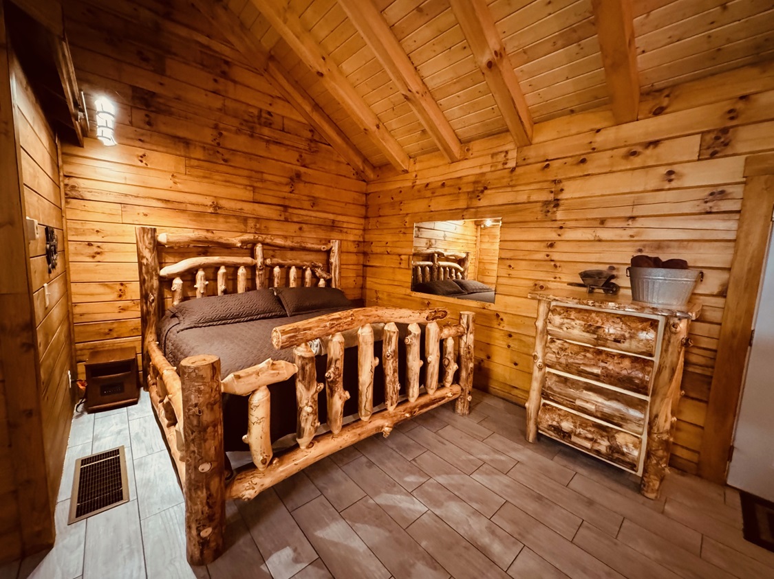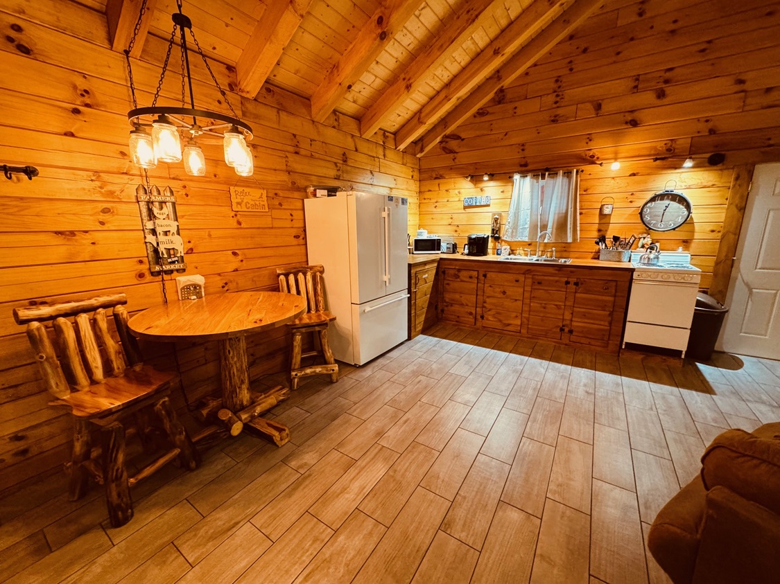 Holler INN is a new luxurious two person cabin. This is our only cabin with the unique feature of an indoor "outhouse." The floor plan is spacious and open concept. There is a nice fully equipped kitchen. The living room area has a 65" tv, Wifi, Roku stick for streaming, and gas log fireplace. Choose between a jacuzzi bathtub or the spacious shower with dual shower heads. Fall asleep in the king size aspen bed and do it all over again.