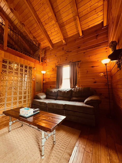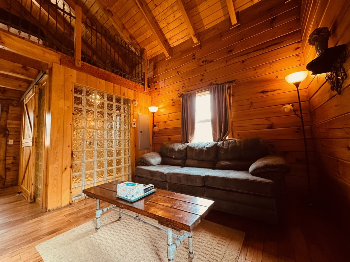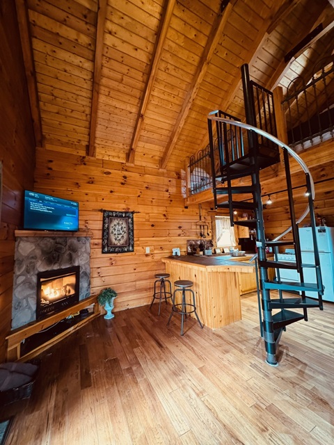Newer loft style cabin, Camelot, is fit for a king with its loft-style romantic setting featuring spiral staircase and large glass shower. There is a queen-size bed in loft, Starlink WIFI, Smart TV and streaming only, Stone Electric fireplace, central air, gas grill. NOTE: Four-wheel drive required in inclement weather.