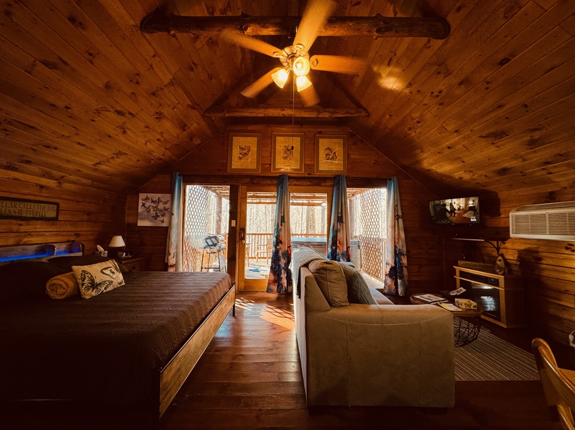 The Butterfly Bungalow is a one room log cabin with a hot tub and sits in the pine woods on our main office property near all area state parks. The back of the cabin has all glass windows to provide an incredible view of the forest and easy access to the back porch. This cabin provides a very spacious layout for 2.
