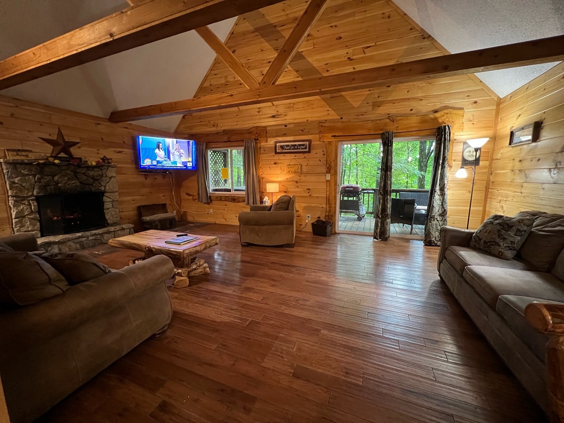 Thousand Wishes is nice cedar pet friendly cabin located on our Ash Cave property. Stone log burning fireplace. Hand made aspen furniture throughout with a King-size bed in the loft, Queen-size in bedroom, WIFI with Smart TV and streaming only, 2 sofa bed's in living room and 1 full bathroom. It is walking distance from our convention center, day spa and gardens. Accommodates 6 guests.