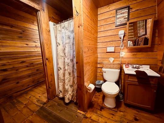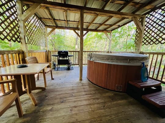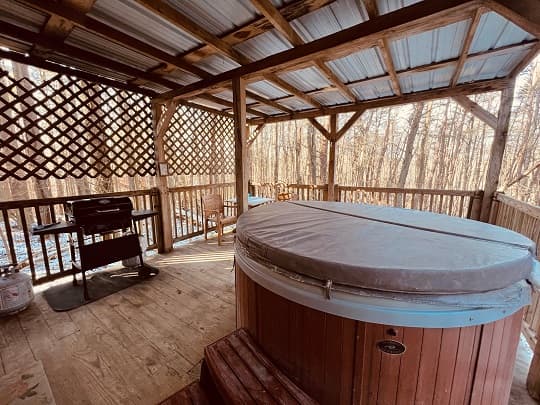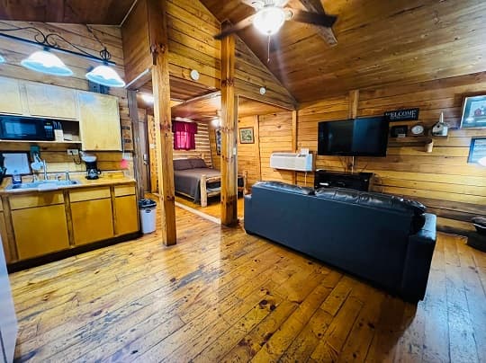 PET FRIENDLY. Above The Rest is a 6 person cabin with one private queen bedroom with a master bathroom. There are two more private queen bedrooms with a shared bathroom. The cabin has starlink wifi, a smart tv with streaming, central air, propane fireplace, gas grill, hot tub and a standard kitchen with a drip coffee maker. This is our closest cabin to Old Mans Cave approx 2-3 miles away. NOTE: Four-wheel drive recommended in inclement weather.