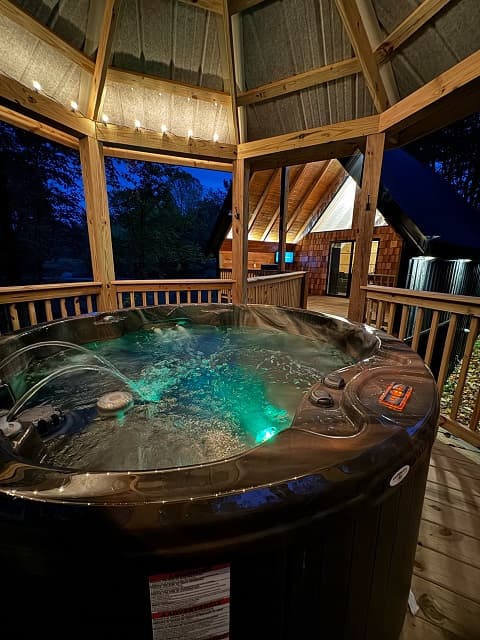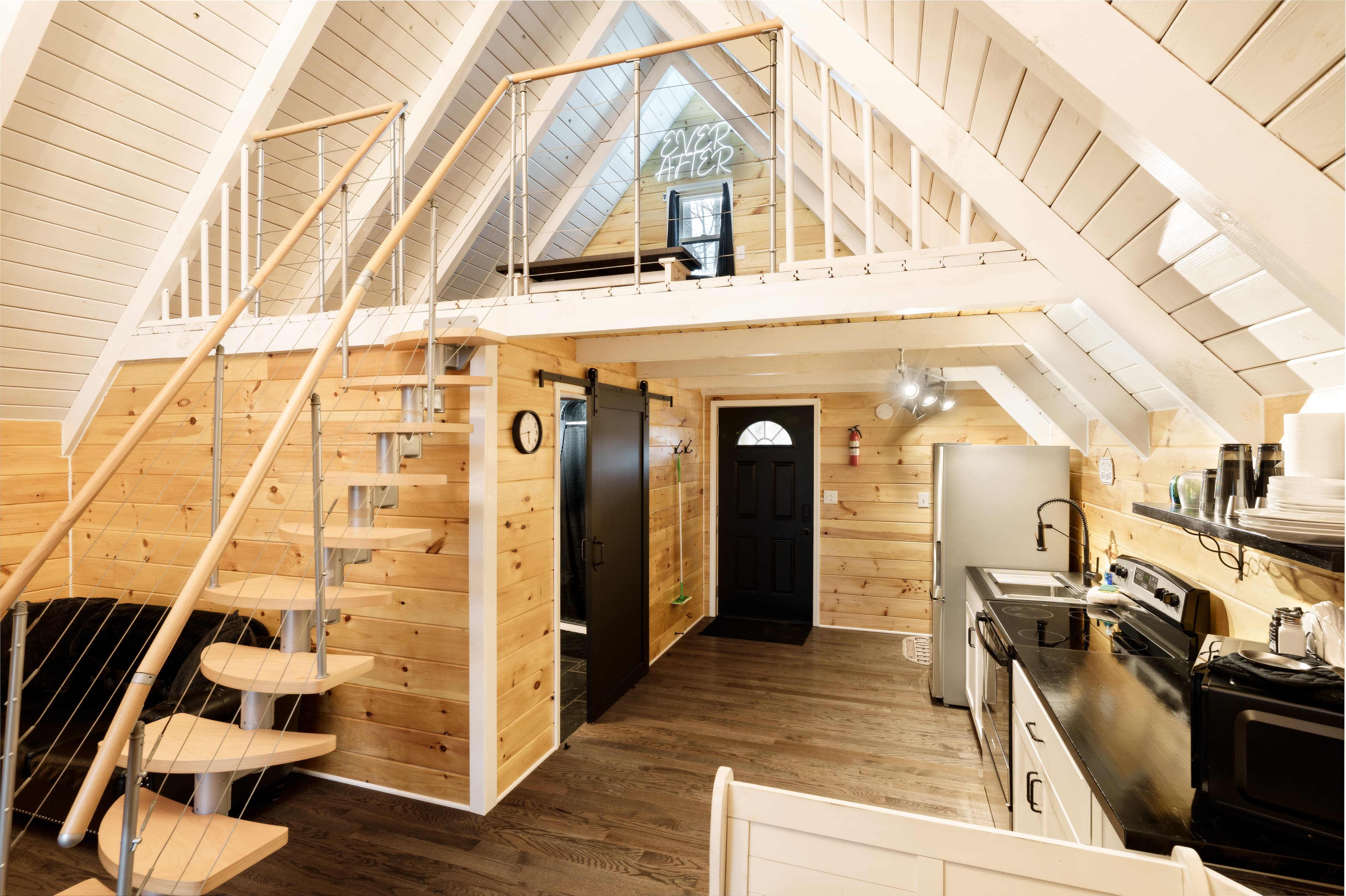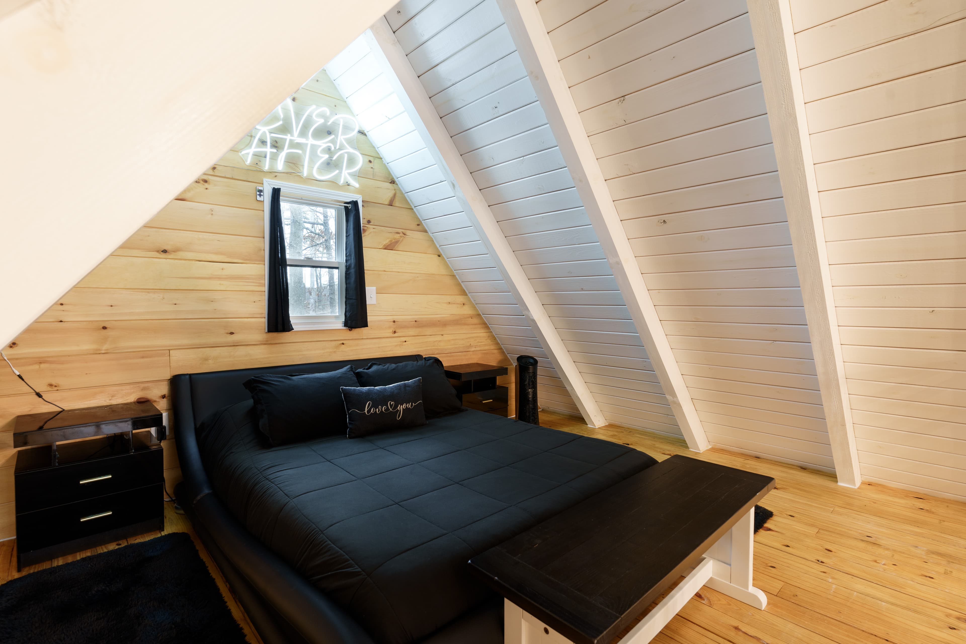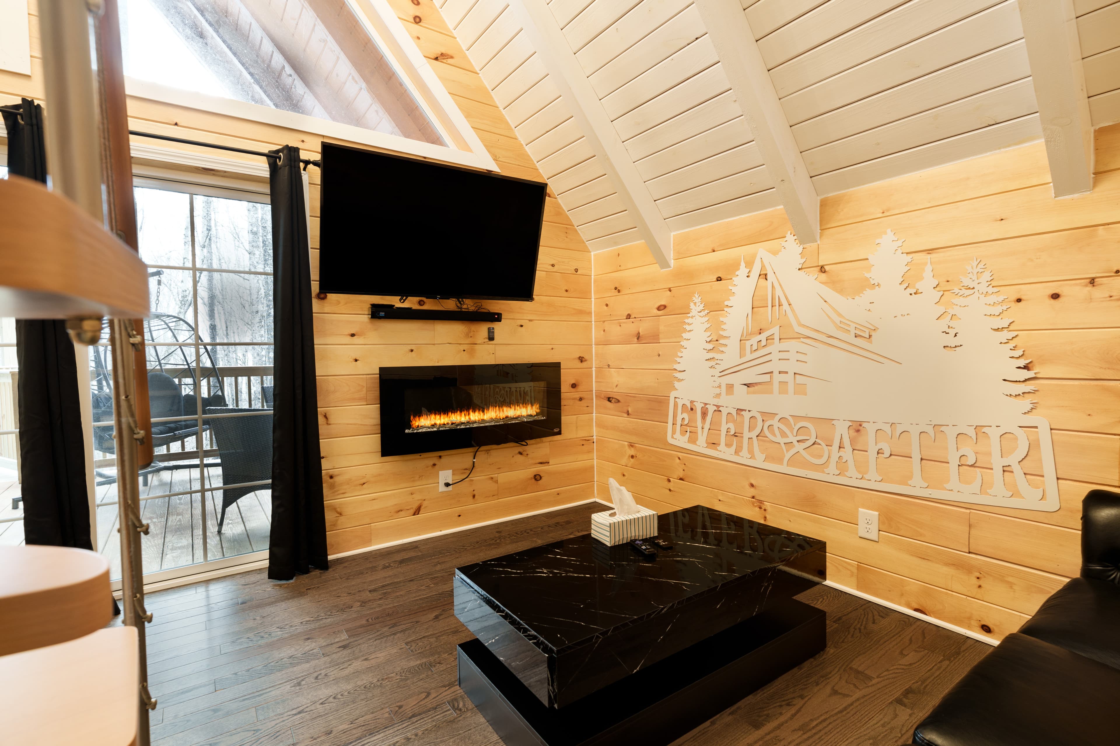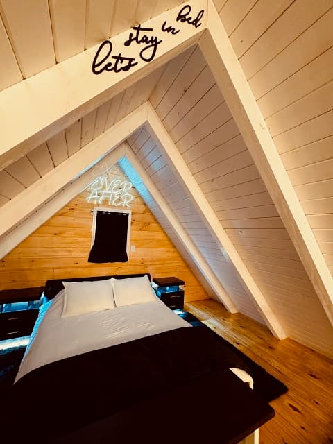 NOT PET FRIENDLY. Ever After is a luxury two person A-Frame. Real Cedar shakes on both ends of the cabin, modern style kitchen with full size appliances. Oak hardwood floors throughout the main living space with breakfast nook seating. Large 55in Smart TV, Starlink WIFI, and streaming only. Electric fireplace that provides the perfect ambiance. Choose between a jacuzzi bathtub or the beautiful luxury nero marquina tile shower. Fall asleep in the queen size Ever After loft with dual lit bedside tables. The hot tub gazebo over 20 foot above the ground is sure to make your experience memorable!