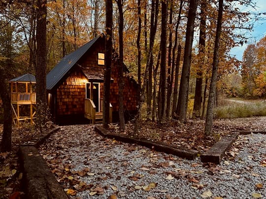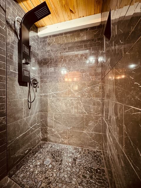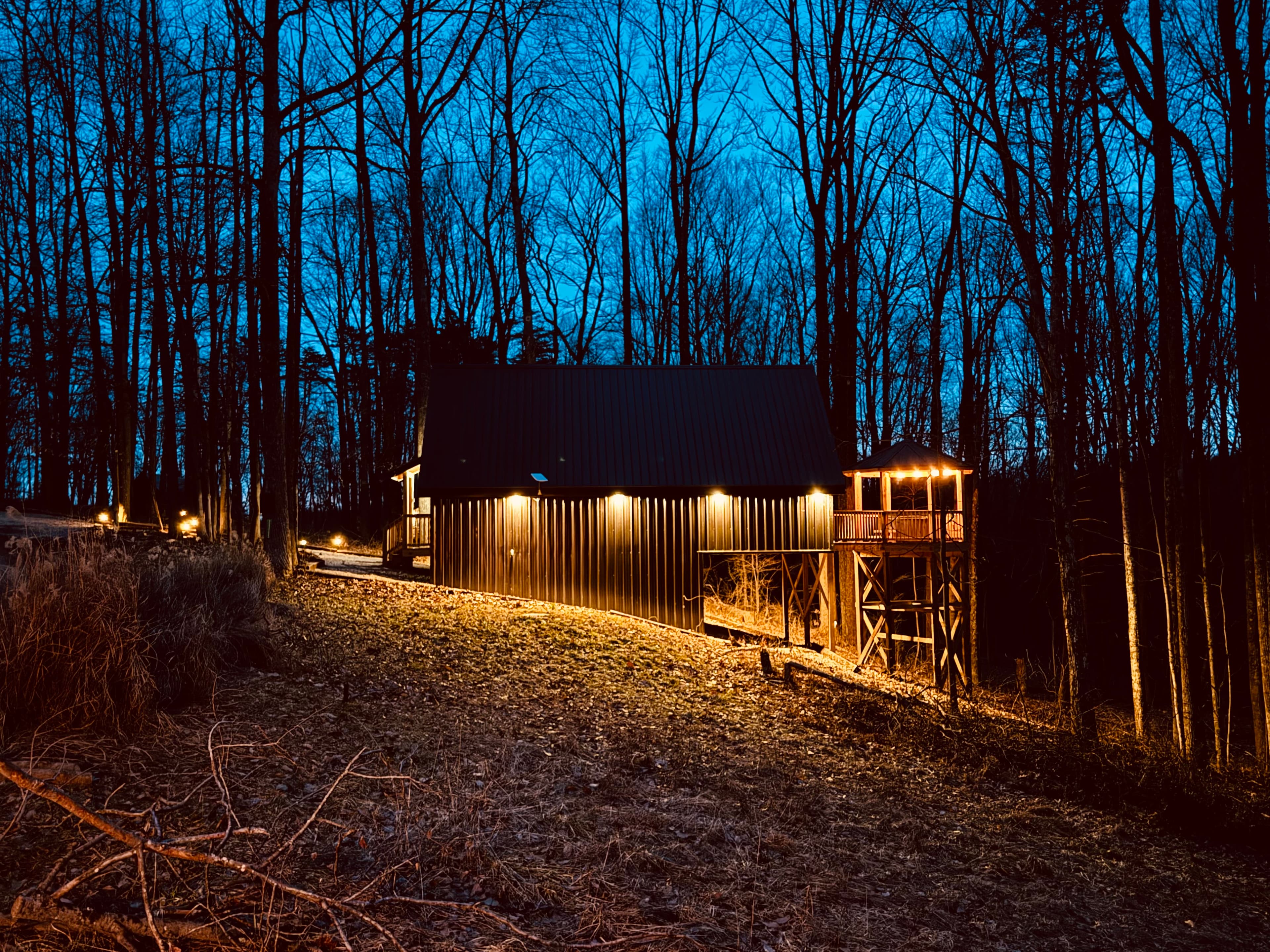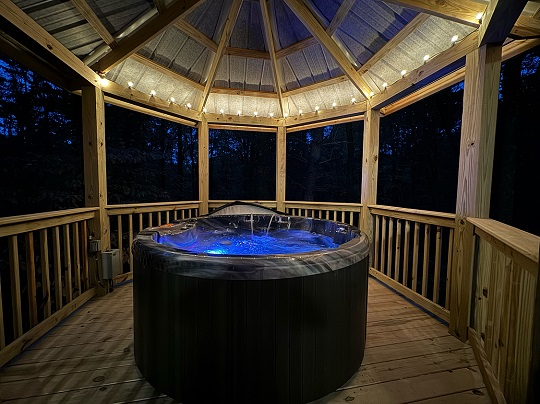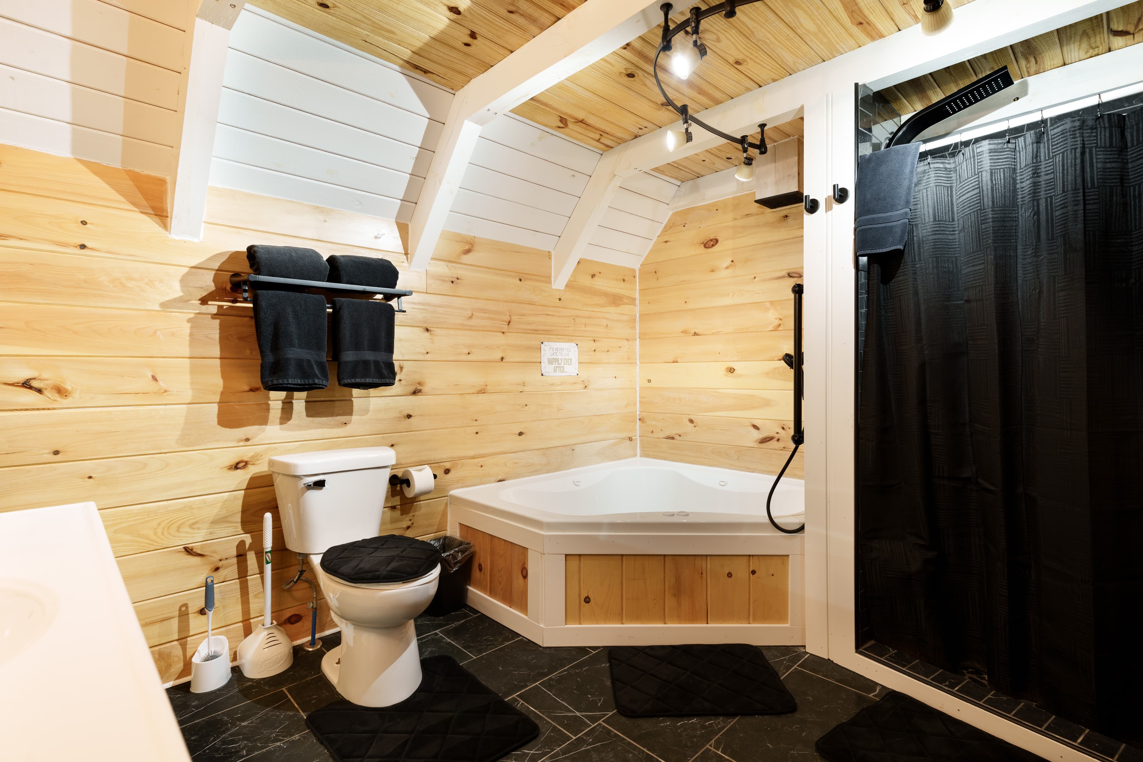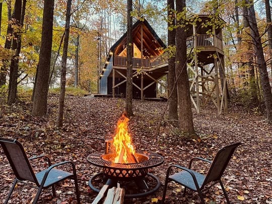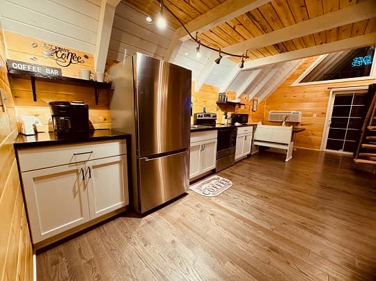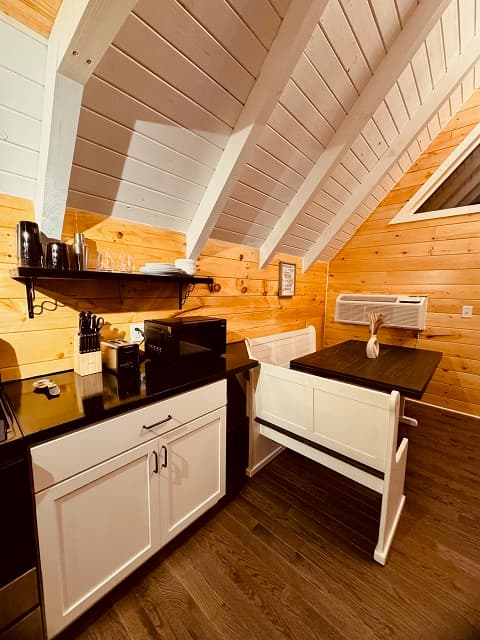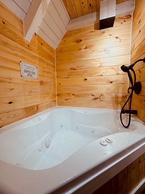 NOT PET FRIENDLY. Ever After is a luxury two person A-Frame. Real Cedar shakes on both ends of the cabin, modern style kitchen with full size appliances. Oak hardwood floors throughout the main living space with breakfast nook seating. Large 55in Smart TV, Starlink WIFI, and streaming only. Electric fireplace that provides the perfect ambiance. Choose between a jacuzzi bathtub or the beautiful luxury nero marquina tile shower. Fall asleep in the queen size Ever After loft with dual lit bedside tables. The hot tub gazebo over 20 foot above the ground is sure to make your experience memorable!
