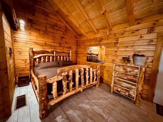 NOT PET FRIENDLY. Holler Inn is a luxury two person log cabin. Holler Inn offers a truly unique experience with a large jacuzzi bath tub, spacious dual shower and its very own indoor/outhouse commode. It has an open floor plan with a king size aspen log bed, 65 inch streaming TV, starlink wifi, gas fireplace and a standard furnished kitchen with a keurig duo. The private back deck has a hot tub, gas grill, and a propane firepit with seating. There is an outdoor firepit ring as well.