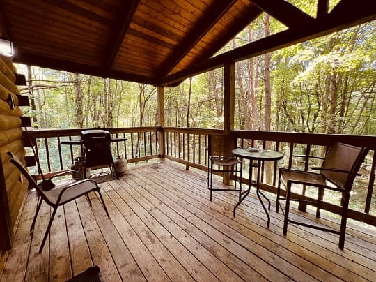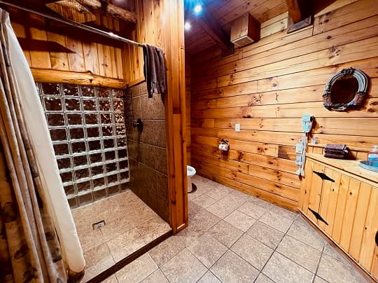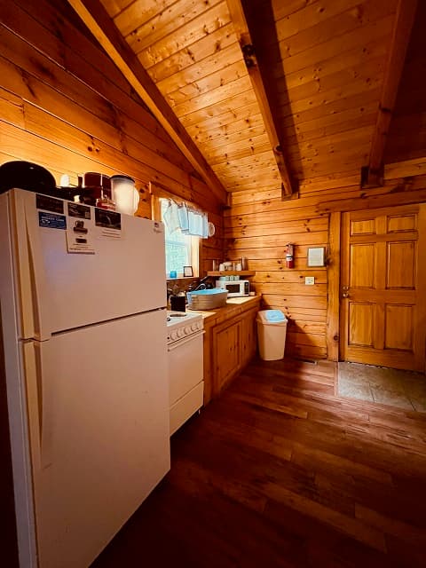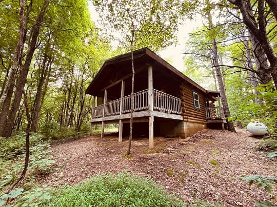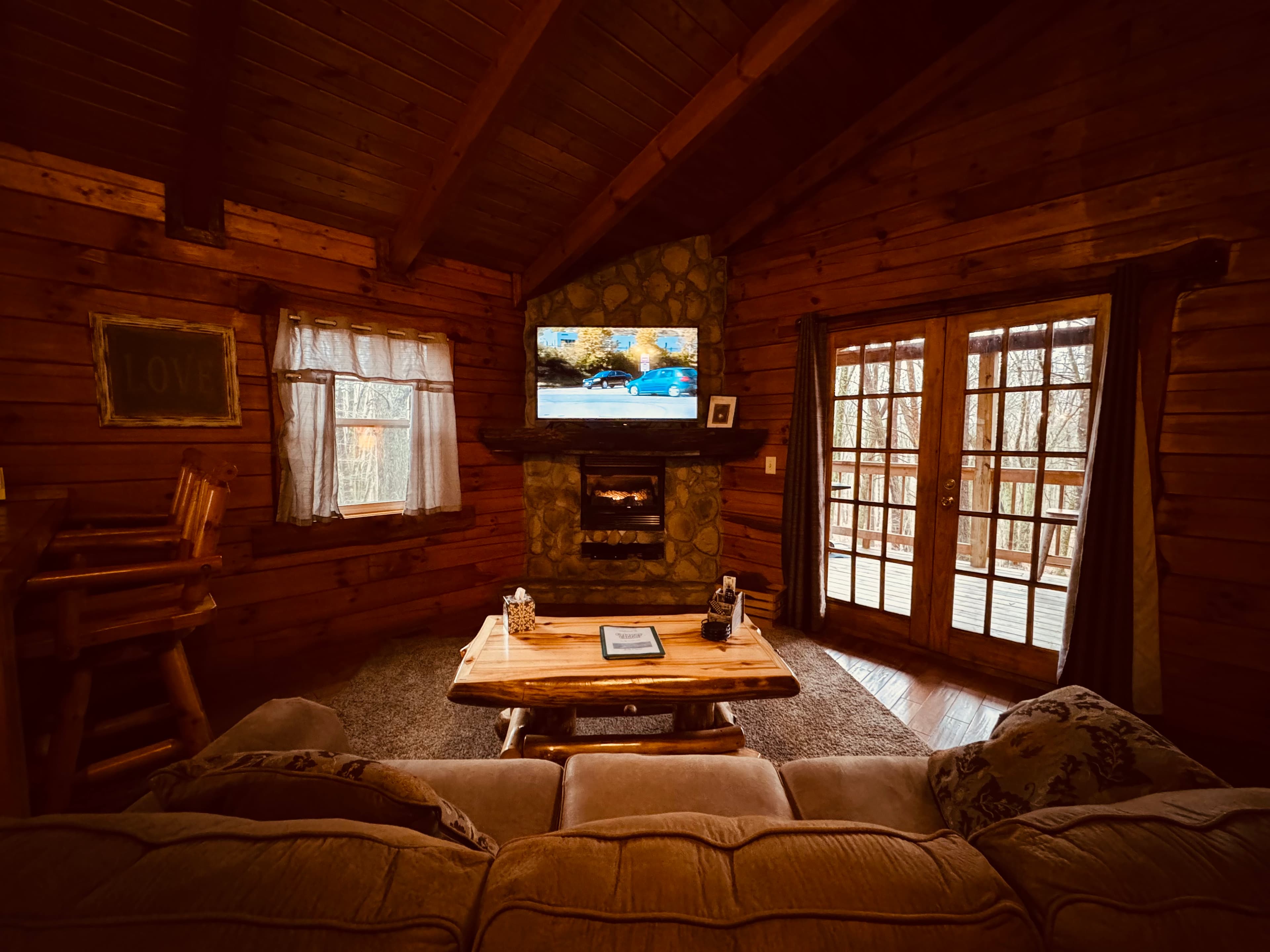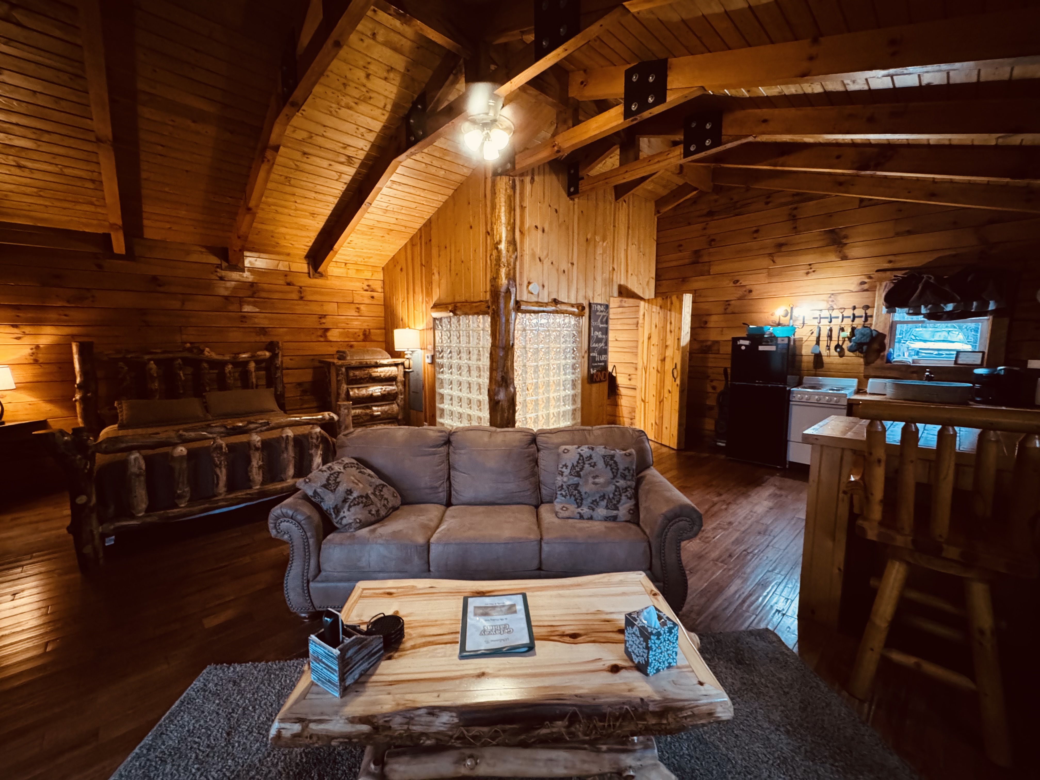 NOT PET FRIENDLY. Open floor plan two person cabin with a beautiful large glass block walk in shower and stone gas fireplace. It also has an amazing hand made aspen queen bed with a matching dresser, coffee table and sofa. Hot tub and gas grill on the deck. Keurig Duo for your morning brew.