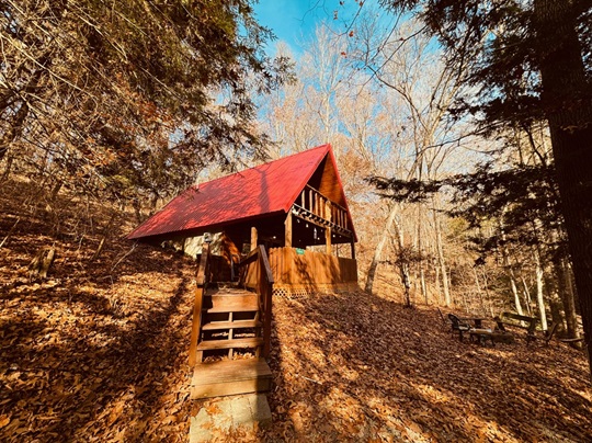 NOT PET FRIENDLY. The Stargazer is a unique A-frame two person log cabin. The loft has a queen bed with a catwalk out to the upper deck with seating for your enjoyment. The lower deck has a hot tub, gas grill and seating as well. The cabin is equipped with starlink wifi, a roku smart tv with streaming, gas fireplace, glass block tiled shower, and a standard kitchen with a drip coffee maker. The cabin also has a mini split unit for AC/heat as well. Located approximately 2-3 miles from Old Man's Cave. Four-wheel drive recommended in inclement weather.