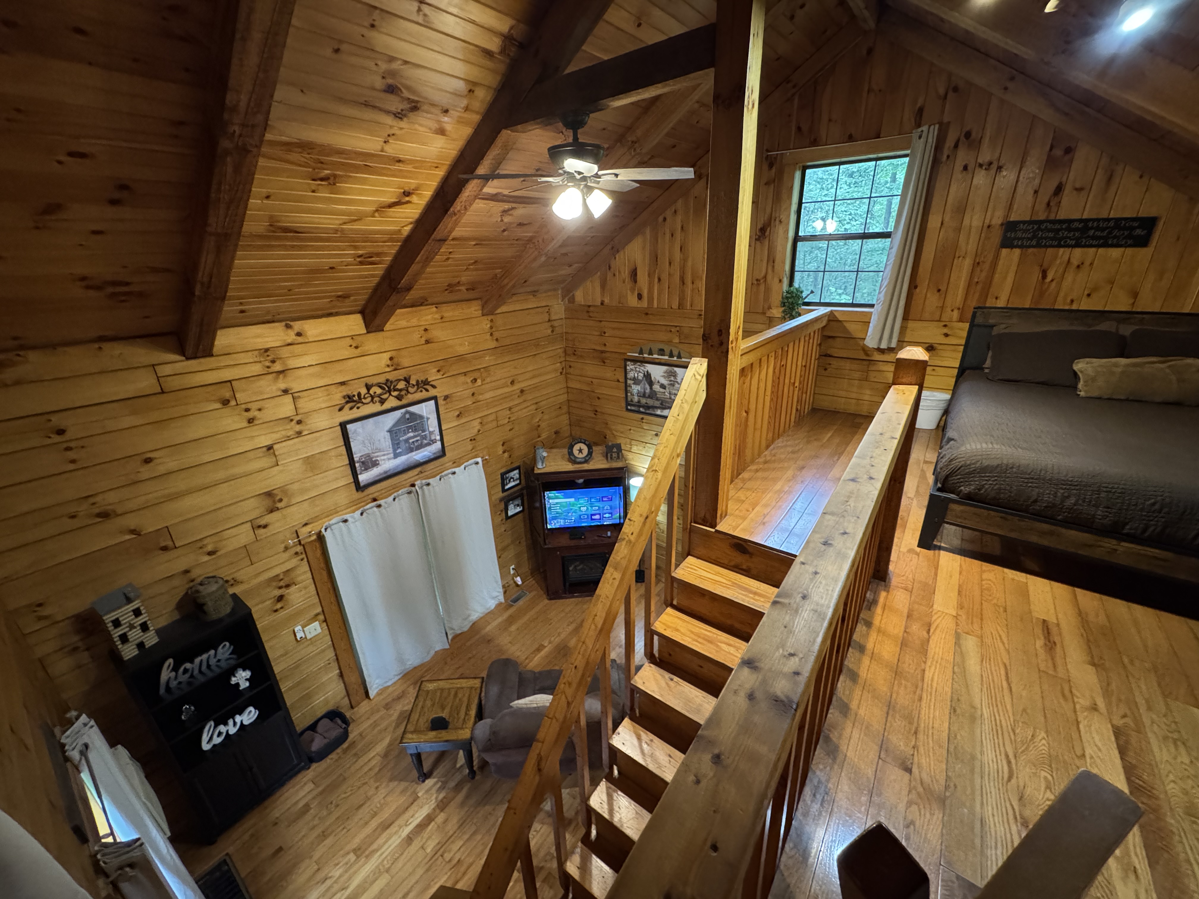 PET FRIENDLY. The Homestead is an adorable quaint cabin for two guests. It is secluded and sits at the end of the lane with a great private feel. It offers a round hot tub, electric fireplace, gas grill, ceiling fan, queen size bed, central heat and air, and Starlink internet with a streaming tv. There is a full kitchen with a drip coffee maker. It is located at our Bishop's Ridge location on Fairview Rd, just a few miles drive to the state parks.