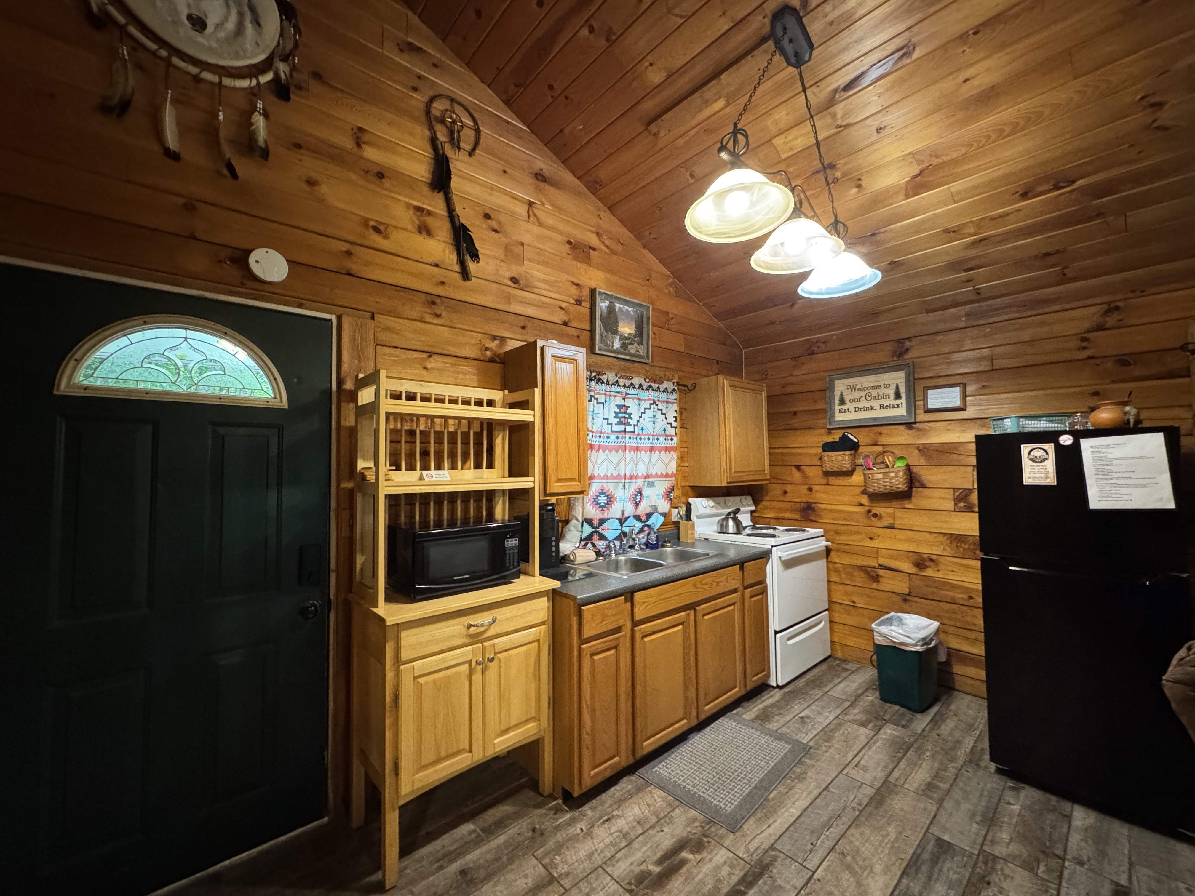 PET FRIENDLY. The Shawnee is a one bedroom cabin but has the capacity to fit 4 guests comfortably. There is a King bed in the private bedroom, and queen pull-out sofa in the living room. Other amenities for this cabin include a large hot tub, gas grill, satellite TV with DVD, air conditioning, electric fireplace, standard kitchen appliances and a Keurig coffee maker. This cabin is also great for animal lovers as it has a wildlife feeding station.