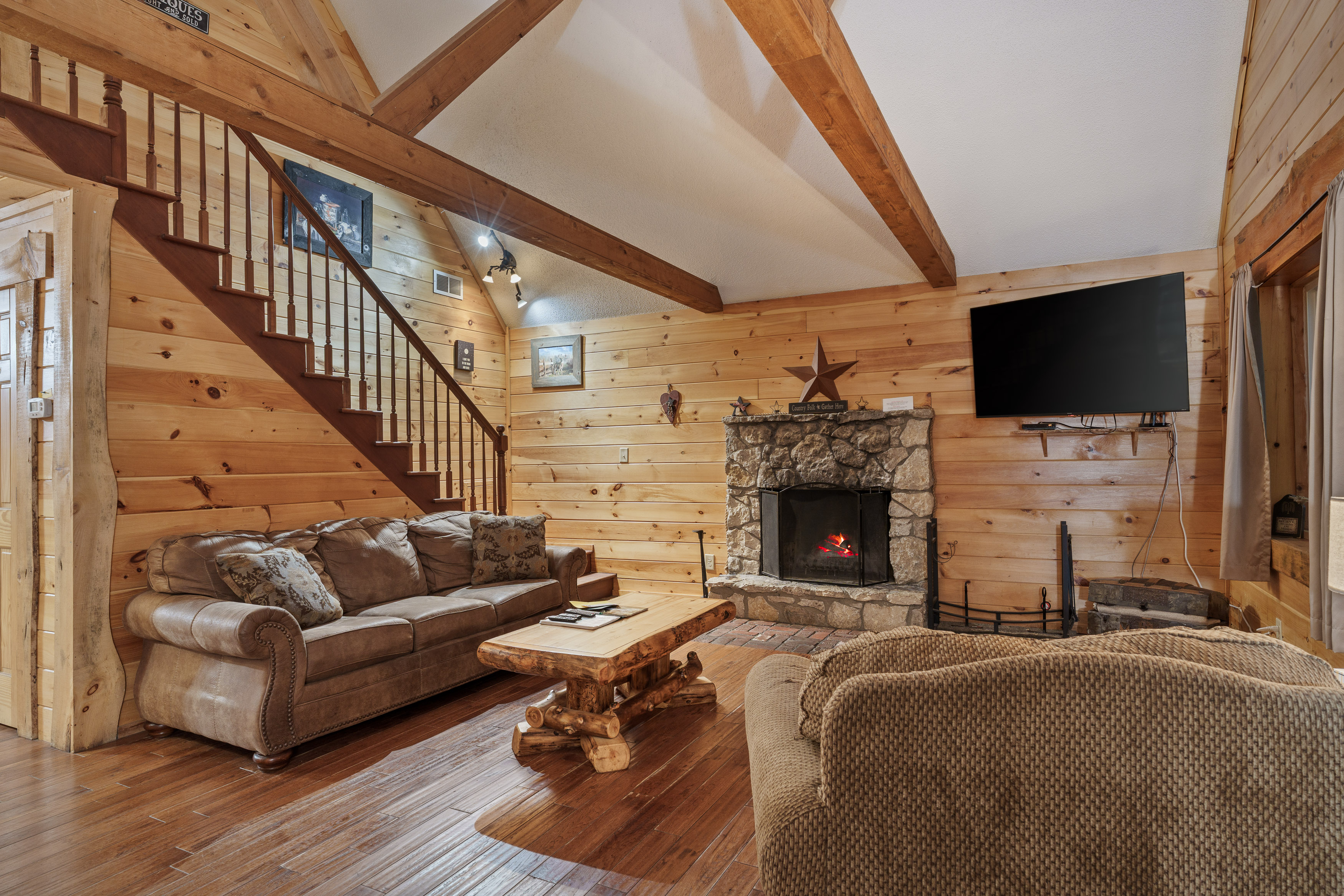 PET FRIENDLY. Thousand Wishes is a larger cedar cabin, located on our Ash Cave property that accommodates four-six guests. In the loft is a King aspen bed and dresser. The main level offers a private queen bedroom, one full bathroom, stocked standard kitchen with a Keurig duo and the living area has two queen pullout sofas for additional sleeping. The cabin has Starlink WiFi, streaming tv, hot tub, gas grill, wood burning fireplace and outdoor firepit. It is walking distance from our Ash Cave Day Spa, convention center and gardens. Four wheel drive is recommended in inclement and winter weather.
