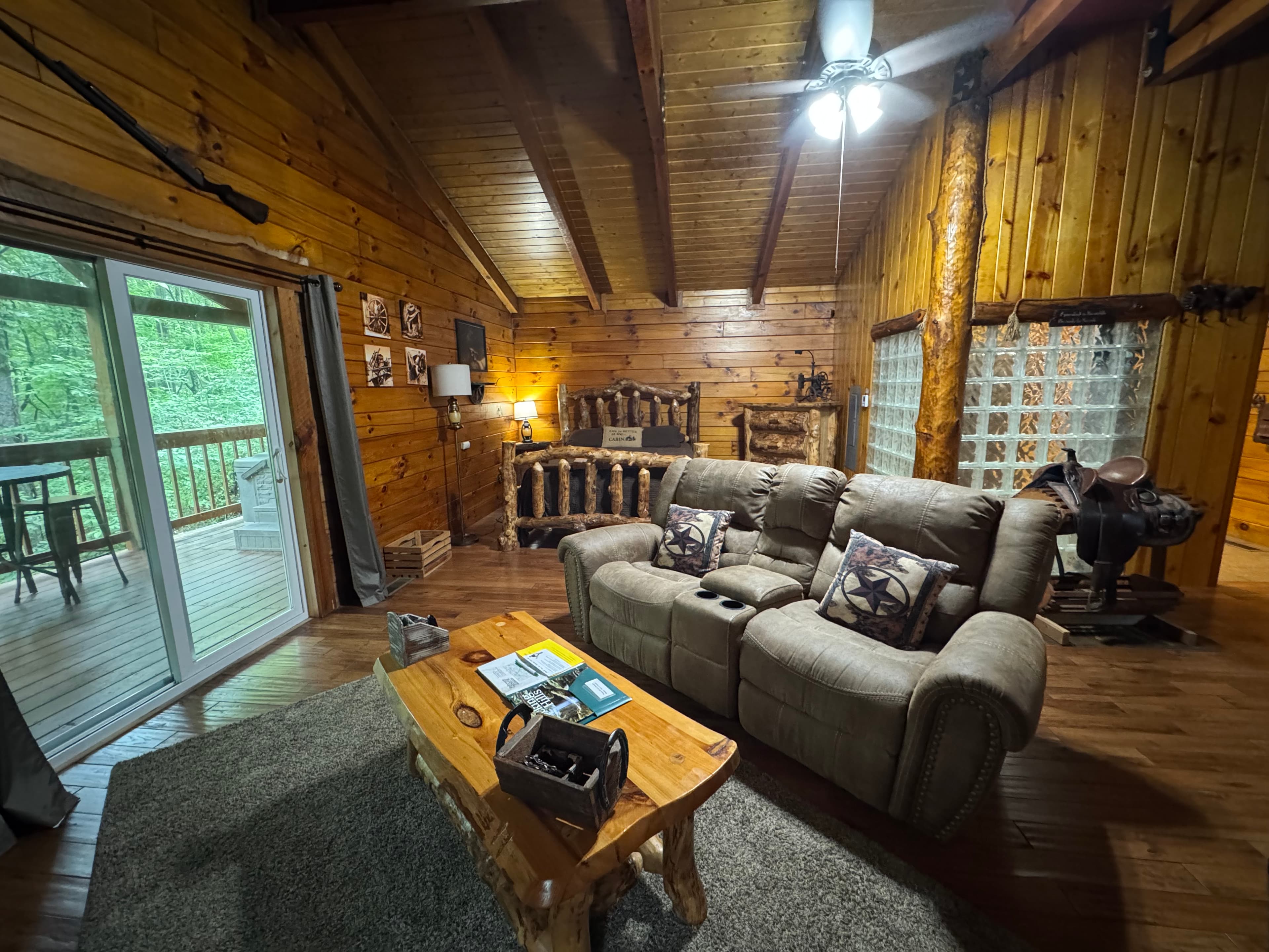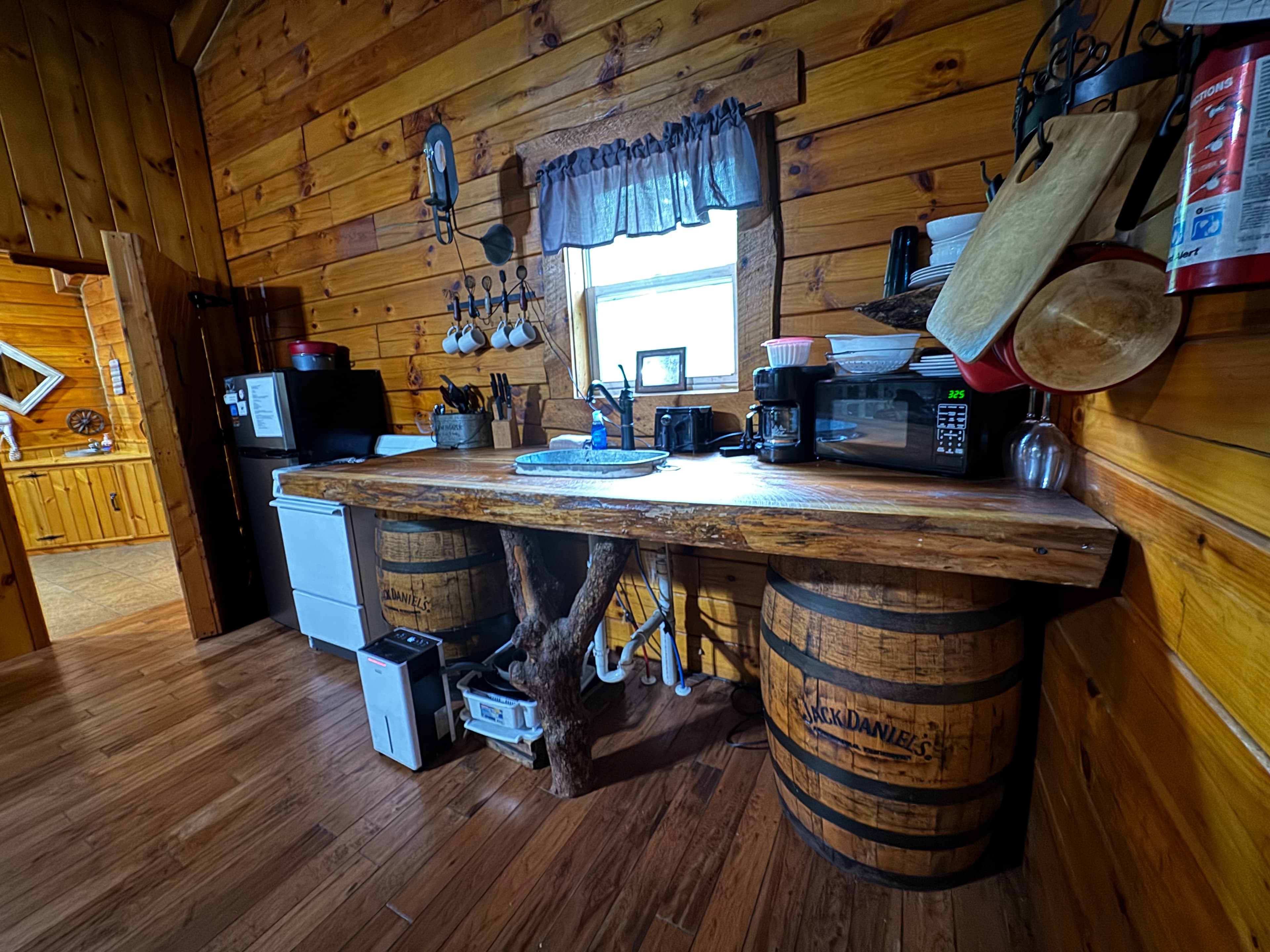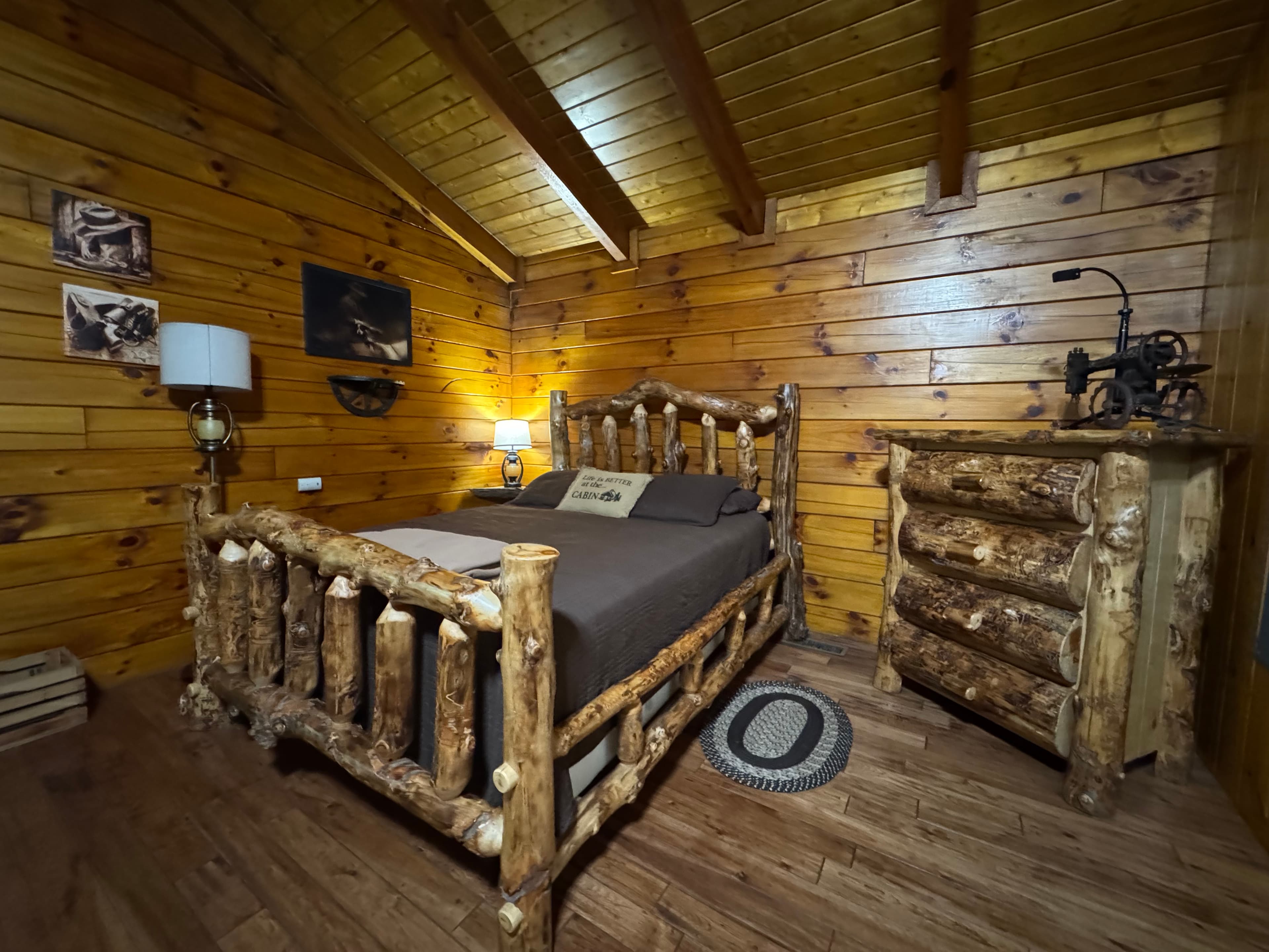 NOT PET FRIENDLY. Whiskey is a newer cabin and its style fits its name. This abode displays an open floor plan and is a 2-person cabin decorated with whiskey barrels from the Jack Daniel's Distillery, and hand made Aspen queen bed with matching furniture. The Whiskey cabin also has a beautiful, large glass block walk in shower and stone electric fireplace creating a relaxing warm environment. Hot tub and gas grill.