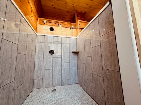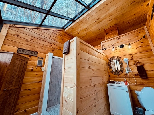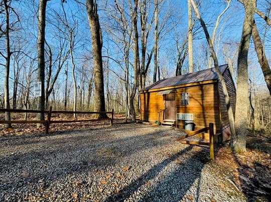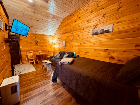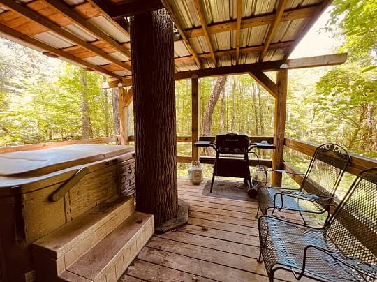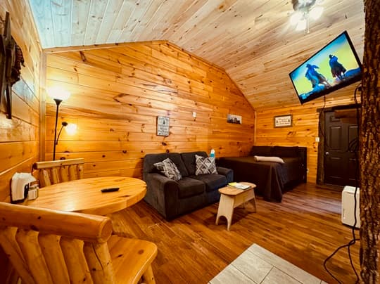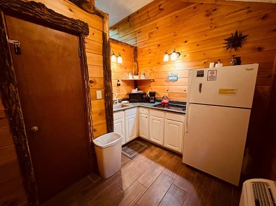 NOT PET FRIENDLY. Whispering Pines is a unique and comfortable cabin for 2 with a queen-size bed, aspen dining table, WIFI, pivoting flat panel Tv, and love seat. A back deck built around a living tree with a gas grill and hot tub. Standard kitchen that features full size fridge, range top only, Keurig coffee pot, and microwave. Whispering Pines is located on our Ash Cave Property that offers gardens, nature trails, wedding/convention hall, and Ash Cave Day Spa that are all walking distance away. 4 wheel drive recommended in inclement and winter weather.